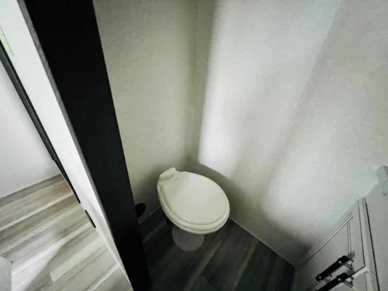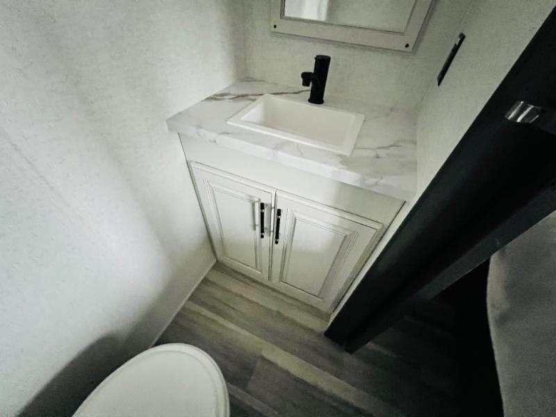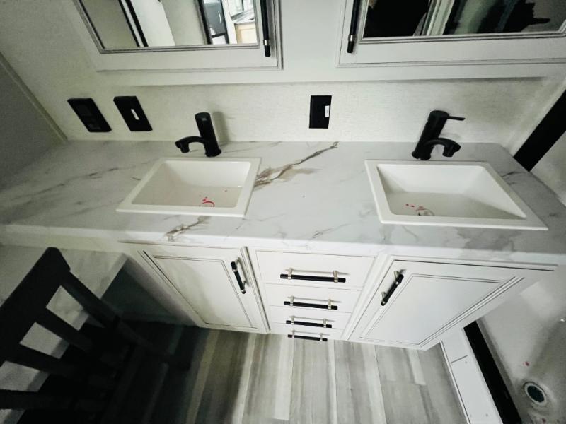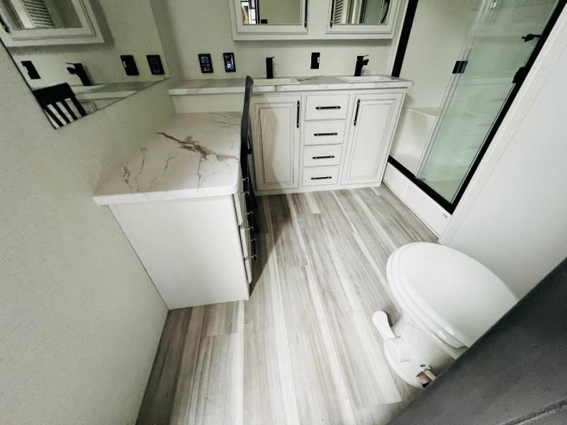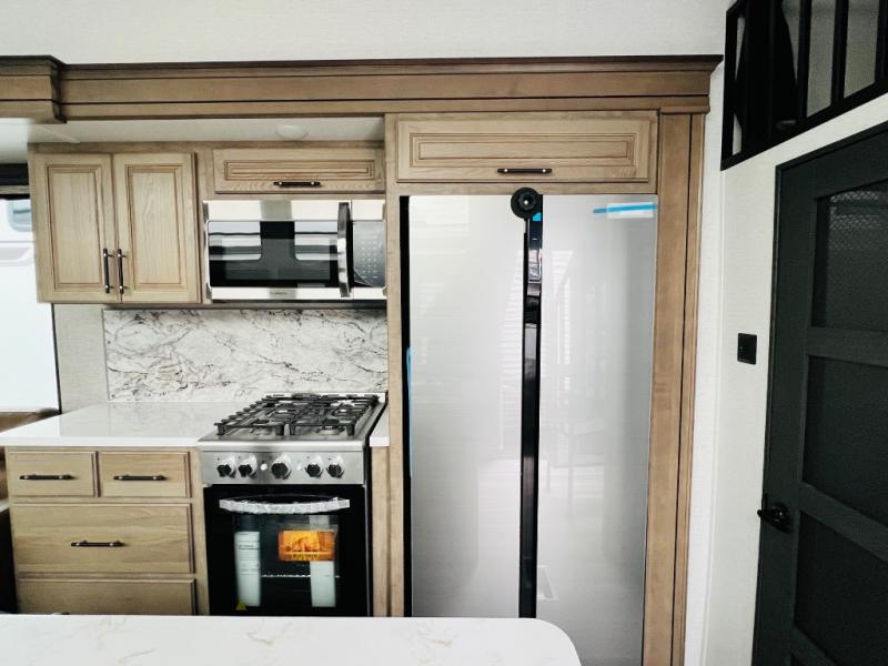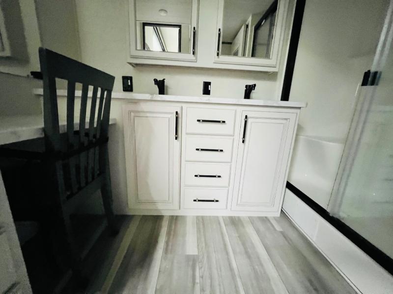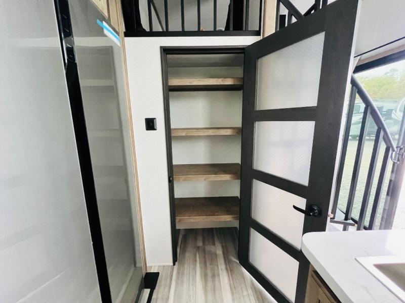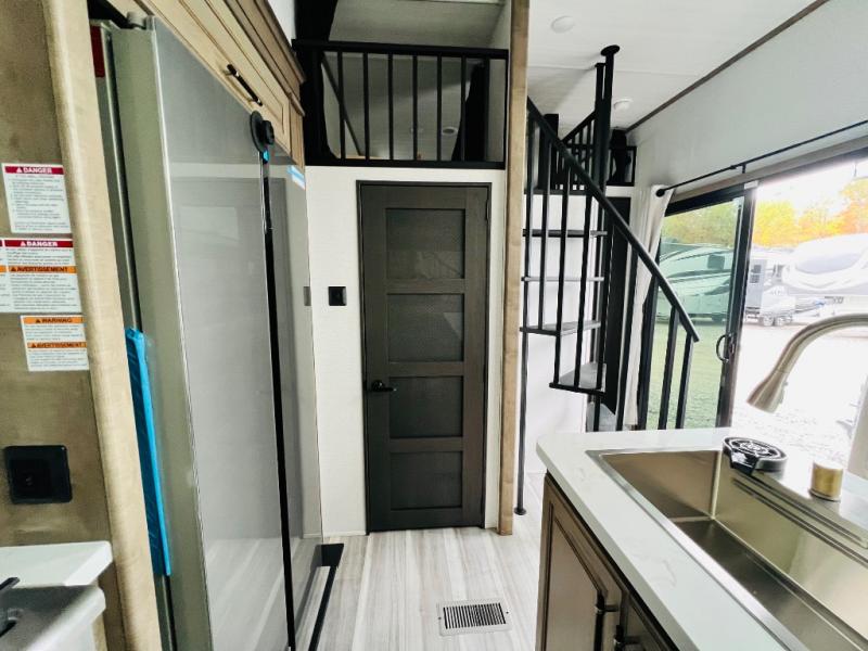 This destination trailer is a home away from home where comfort, relaxation, and entertainment come together in perfect harmony. The rear bathroom is a serene oasis, featuring washer and dryer prep, dual sink, and makeup vanity. Above, the loft area offers a cozy bunk mat, storage shelves, and an entertainment center - perfect for kids or guests. The living area is designed for relaxation and entertainment, featuring a comfortable sectional sofa, entertainment center, and warm fireplace. The kitchen is a gourmet's paradise, boasting a refrigerator, pantry, three-burner cooktop, kitchen island with chairs, and spacious pantry. The front bedroom is a peaceful retreat, complete with a half bath, overhead cabinets, a king bed, a wardrobe, and a dresser. Above, the loft area offers three bunk mats - perfect for kids or guests. Outside, enjoy the shade and protection of our 26' awning and convenient access via two entry/exit doors.