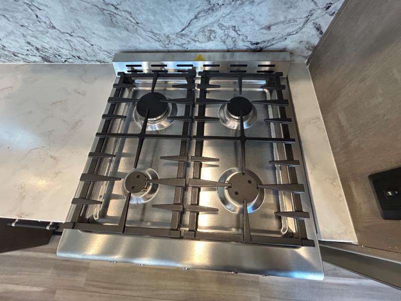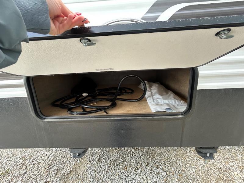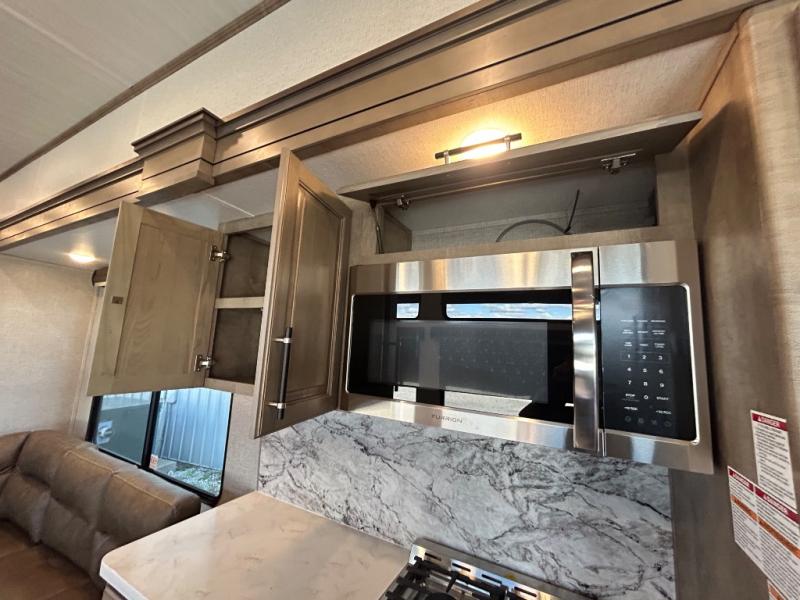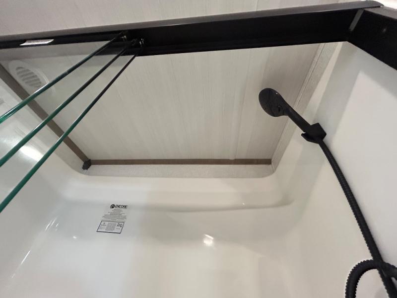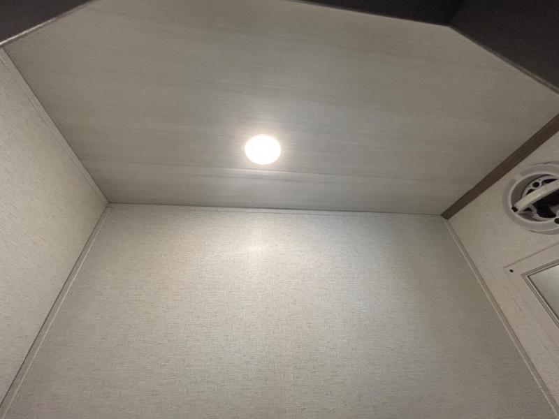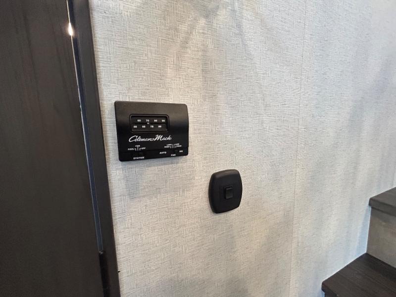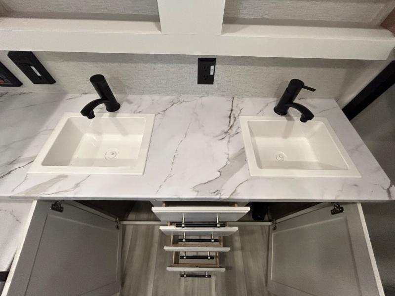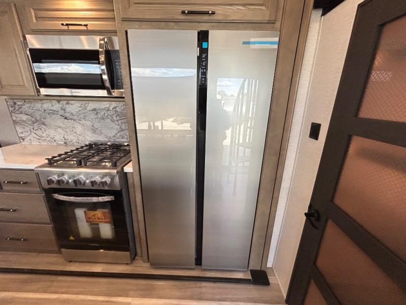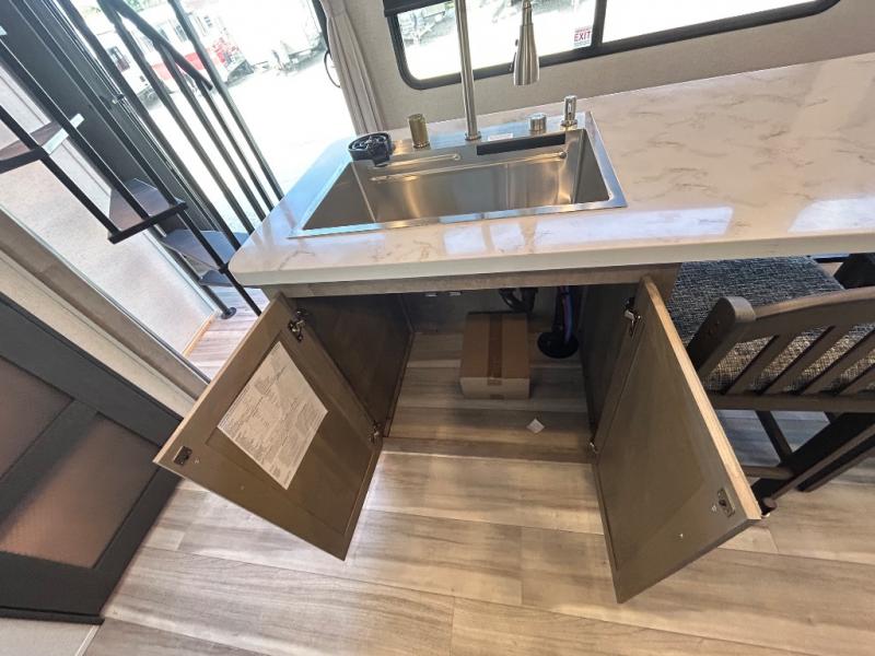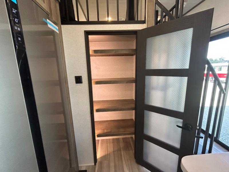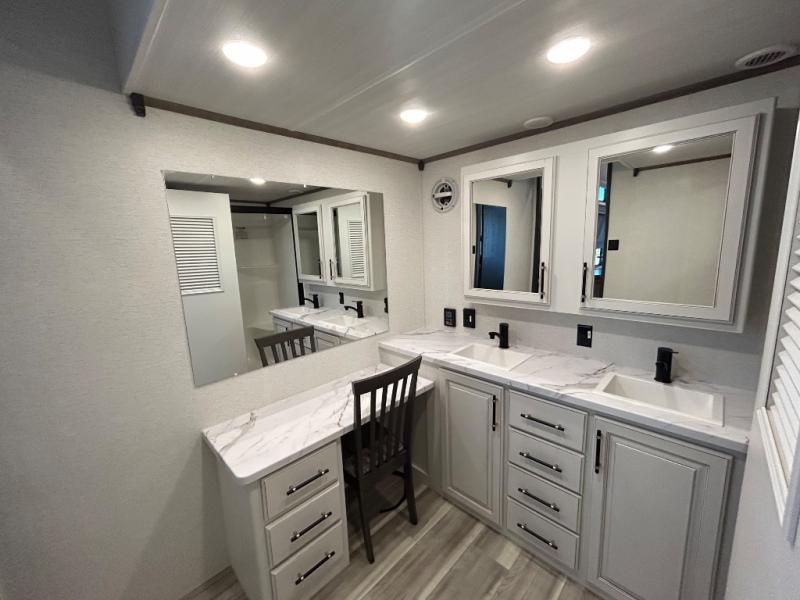 This destination trailer is a home away from home where comfort, relaxation, and entertainment come together in perfect harmony. The rear bathroom is a serene oasis, featuring washer and dryer prep, dual sink, and makeup vanity. Above, the loft area offers a cozy bunk mat, storage shelves, and an entertainment center - perfect for kids or guests. The living area is designed for relaxation and entertainment, featuring a comfortable sectional sofa, entertainment center, and warm fireplace. The kitchen is a gourmet's paradise, boasting a refrigerator, pantry, three-burner cooktop, kitchen island with chairs, and spacious pantry. The front bedroom is a peaceful retreat, complete with a half bath, overhead cabinets, a king bed, a wardrobe, and a dresser. Above, the loft area offers three bunk mats - perfect for kids or guests. Outside, enjoy the shade and protection of our 26' awning and convenient access via two entry/exit doors.