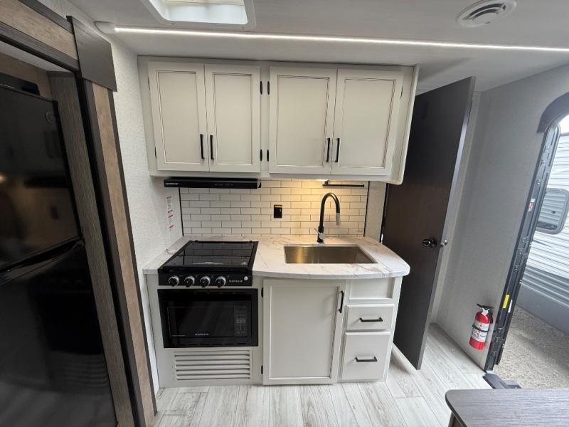 Camping trips in this spacious trailer are sure to bring lasting memories! The little ones or your guests will love the double-size bunks with a flip-up bottom bunk to easily store luggage away. You will have a cozy queen bed in the front bedroom, along with dual closets and nightstands and a laundry chute that will go straight to the pass-through storage. Everyone can meet in the middle living room on the tri-fold sofa, and this will double as additional sleeping space for more campers. And don't overlook the full kitchen with a three burner cooktop, air fryer microwave oven, and 10 cu. ft. refrigerator. There is even an outdoor refrigerator so you can grab a cold drink while relaxing under the 14' awning!