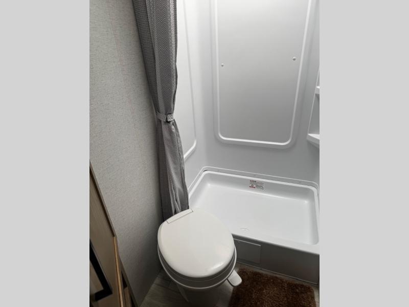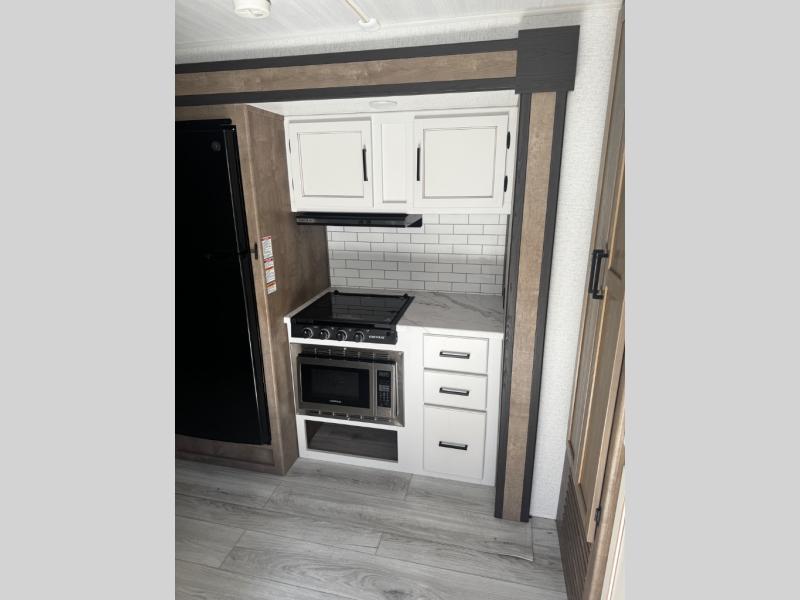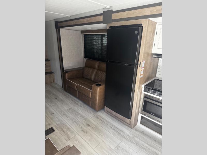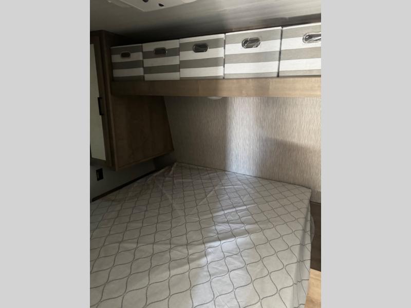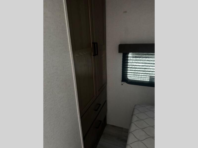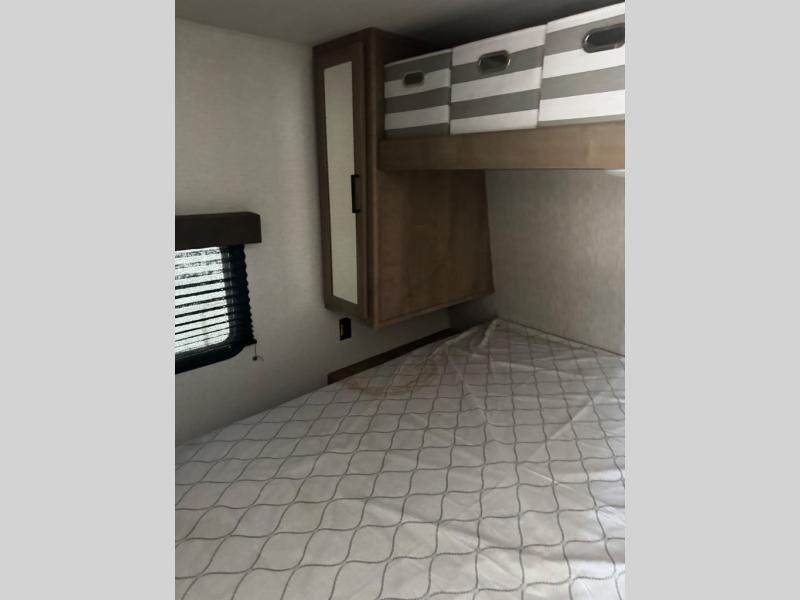 Take your adventures up a notch with this travel trailer in tow! There are queen bunk beds in the back with steps leading up to them and a closet with drawers. The U-shaped dinette will provide space to dine, play games and sleep more guests, and the tri-fold sofa provides even more seating/sleeping space. You will feel right at home in the front private bedroom with a queen bed, dual bedside closets plus a bedroom wardrobe and convenient laundry chute!