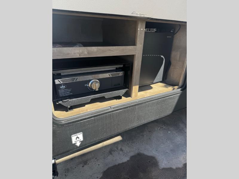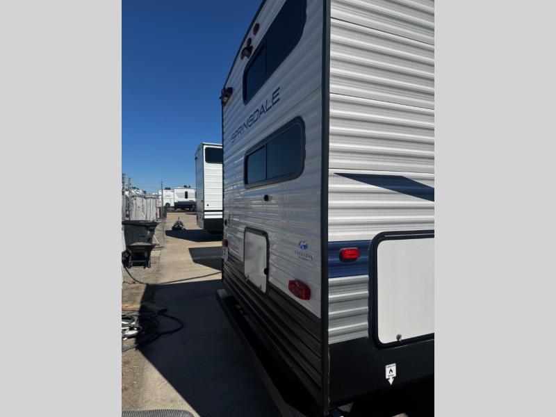 With any Springdale travel trailer by Keystone you will enjoy convenient amenities and comfortable camping features at every turn. The aluminum exterior will be easy to clean, and the power awning provides protection against the hot summer sun. There is also an exterior shower, a walkable roof, and an XL entry assist handle to safely enter and exit the unit. You will find many comforts inside, including a stainless steel sink, ample storage space for your belongings, and cozy sleeping spaces. Start a new adventure today in a Springdale travel trailer!