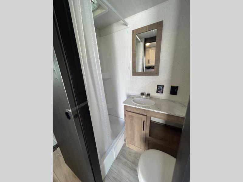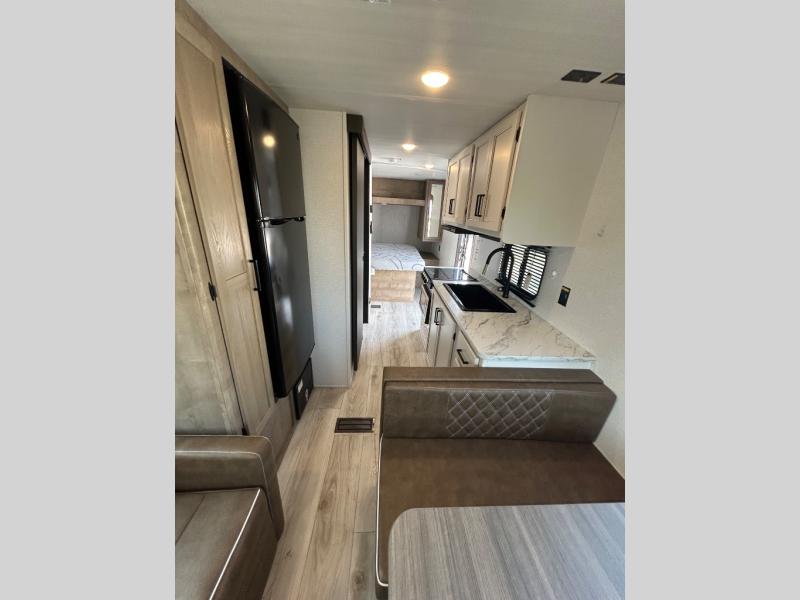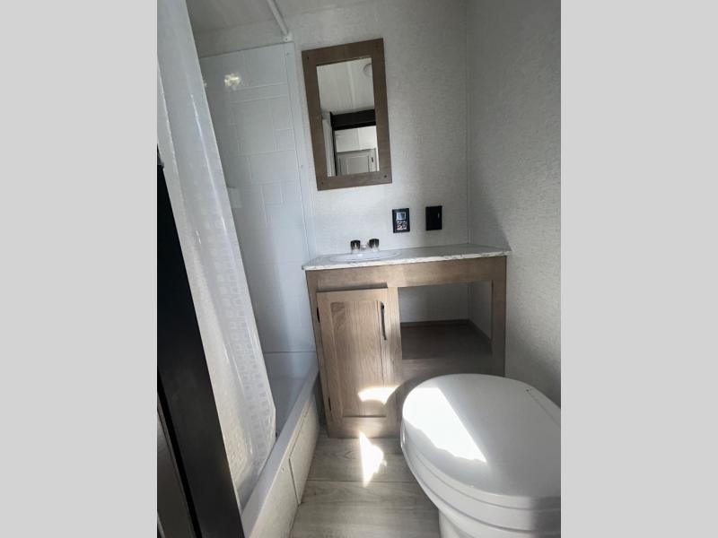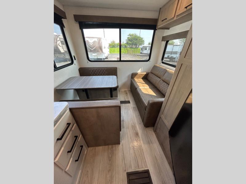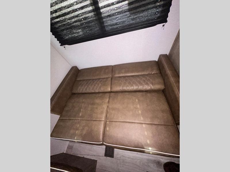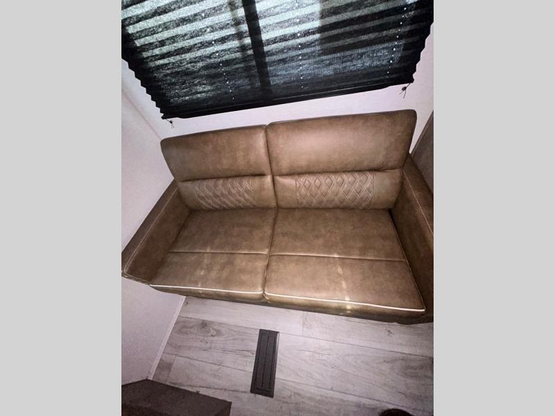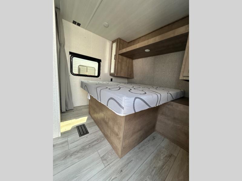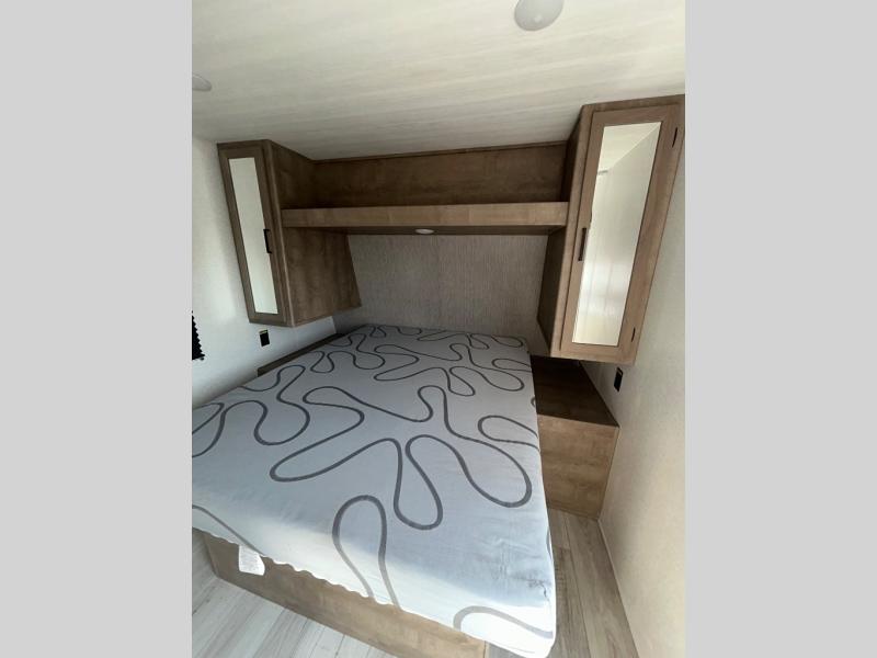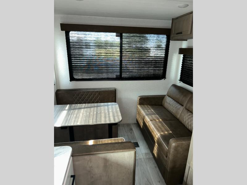 This trailer is perfect for your crew of four to six. There is a queen bed in the semi-private bedroom, along with dual closets and nightstands to keep your things tidy. You can dine each day on the booth dinette, relax on the sofa, and house additional guests here at night. The kitchen includes everything you need to prepare meals each day, including a gas range, microwave, and a 10 cu. ft. 12V refrigerator for cold items. And the full bath on board lets you stay clean throughout each camping trip!