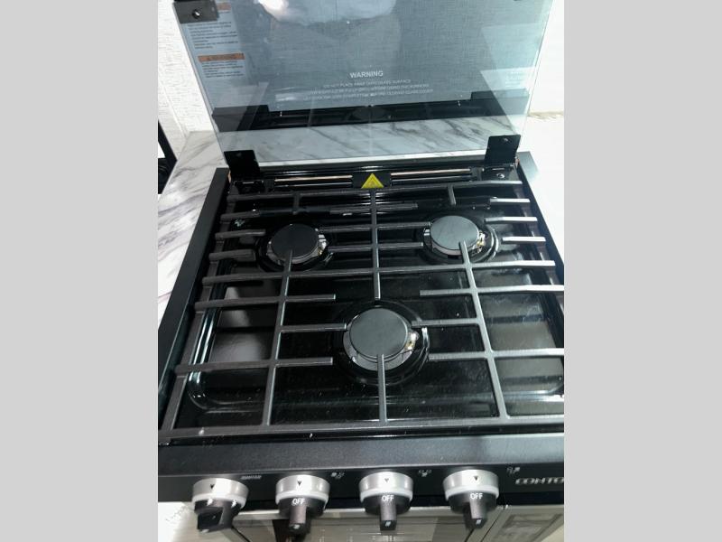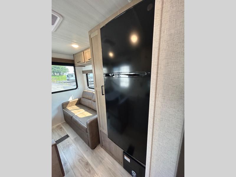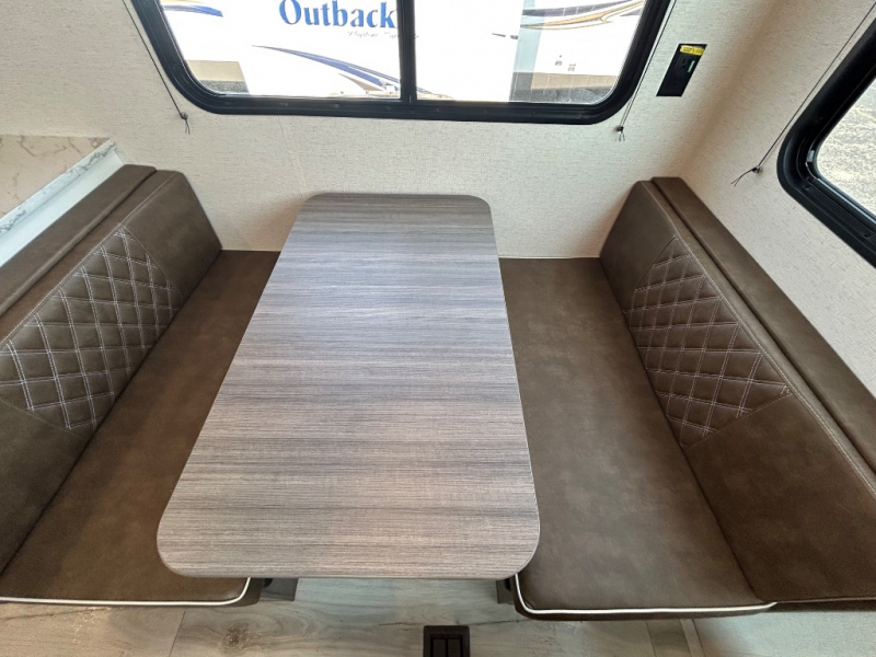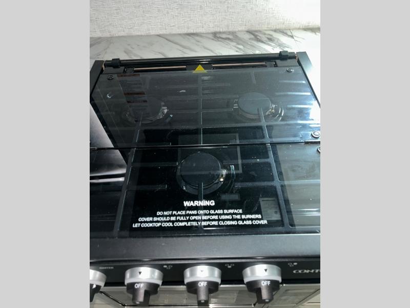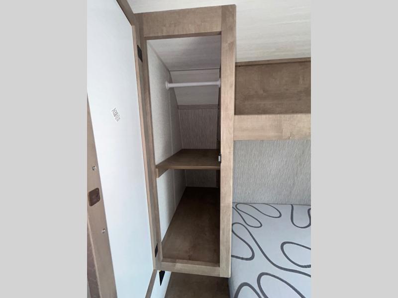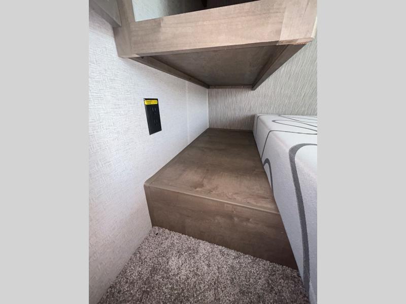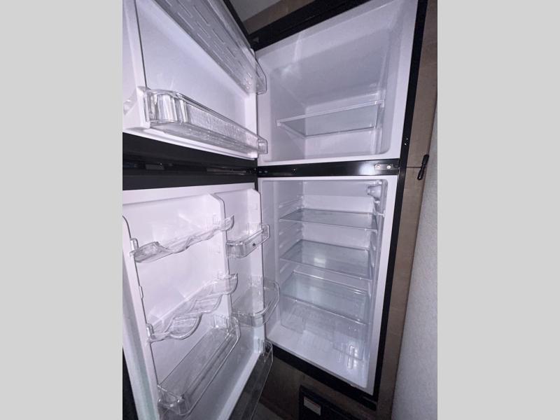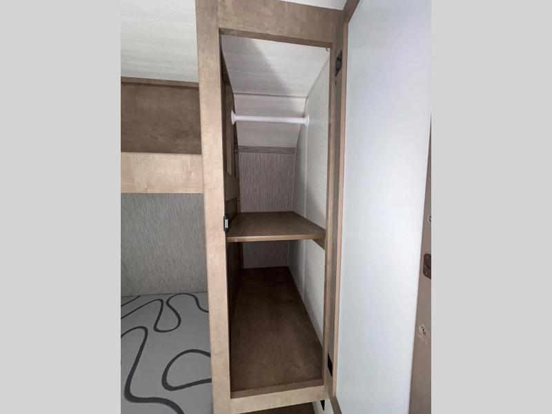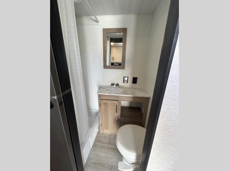 This trailer is perfect for your crew of four to six. There is a queen bed in the semi-private bedroom, along with dual closets and nightstands to keep your things tidy. You can dine each day on the booth dinette, relax on the sofa, and house additional guests here at night. The kitchen includes everything you need to prepare meals each day, including a gas range, microwave, and a 10 cu. ft. 12V refrigerator for cold items. And the full bath on board lets you stay clean throughout each camping trip!