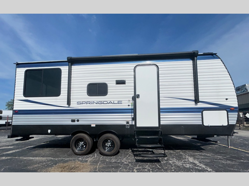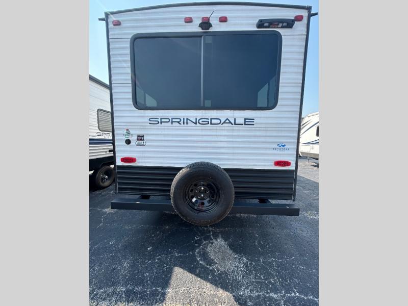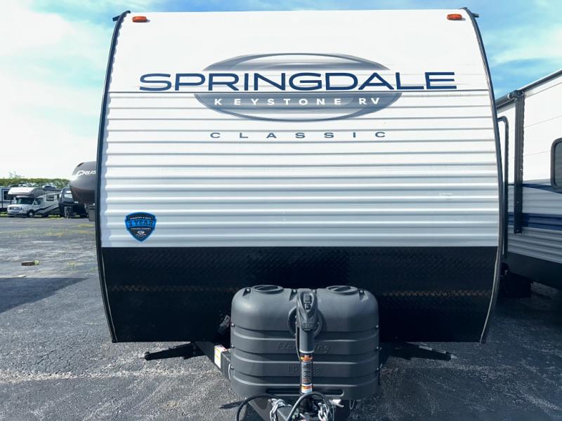 The Springdale Classic travel trailers by Keystone will provide you and your family many great outdoor experiences and it will also be kind to your pocketbook. Each one is constructed with an aluminum exterior, a walkable roof, and an I-beam frame with stamped steel cross-members and outriggers for added strength. There are also heavy duty stabilizer jacks and power tongue jacks outside, along with an XL entry assist handle for added convenience. Each travel trailer includes LED lighting, bedside outlets, and blackout night shades inside that will provide you with more privacy at night.