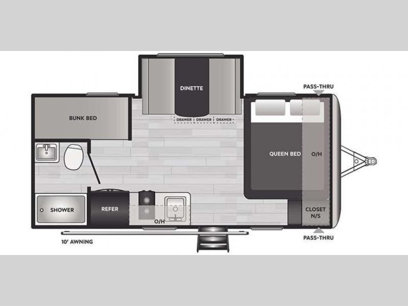 When you say "camping" your kids will immediately think about sleeping on the bunk beds and playing outdoors! There is something about planning the trip that gets everyone excited, and once at your campsite, the excitement grows. You will have your own bed up front as well as a closet and nightstand for your things. The booth dinette doubles as sleeping space and includes drawers for storage, plus the slide provides more floor space. The cook can make warm meals in the galley kitchen, and the full bathroom will keep everyone refreshed and ready for the next day.