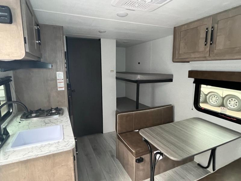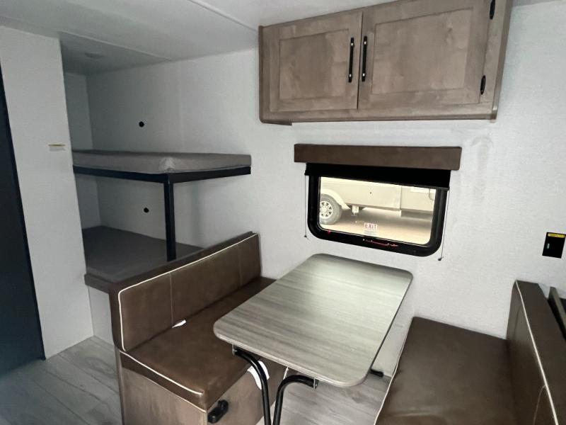 Get ready for outdoor fun with your favorite people when you have this trailer in tow! Once at your campsite, you can easily setup the 10' power awning, grab your camping chairs from the pass-thru storage, and relax or start playing. The cook will love the galley kitchen with the two burner cooktop, plus a refrigerator for cold items. If you like, you can eat inside at the booth dinette which doubles as sleeping space, and of course the kids will love the bunk beds next to the full bathroom. And you will sleep soundly on the front queen bed.