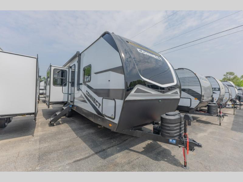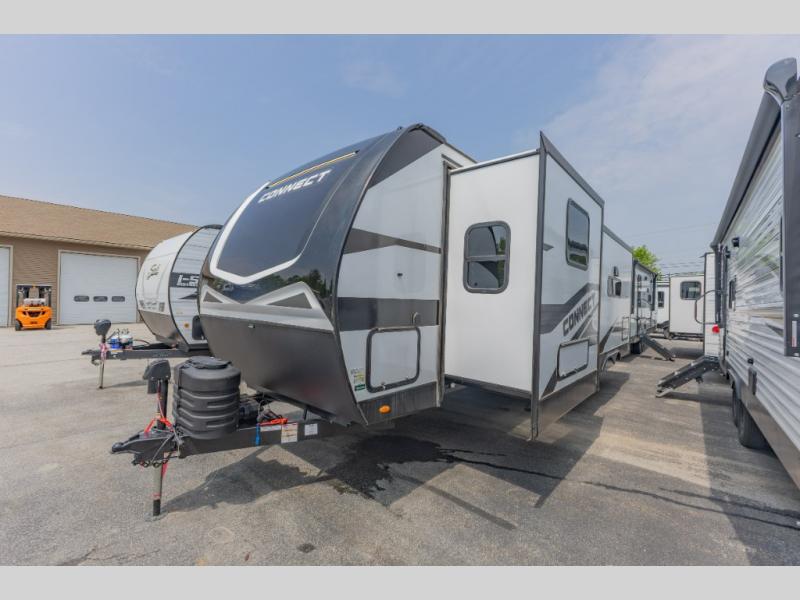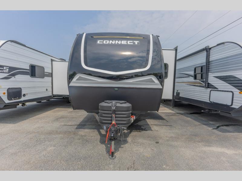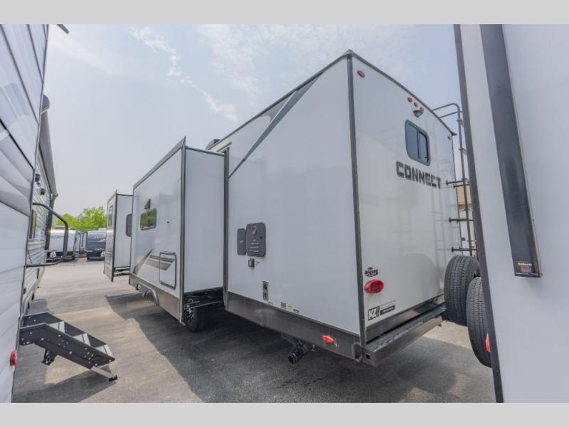 The perfect couple's trailer is found in this Connect! After you wake up each morning on the king bed slide, you can use the walk-in closet to get ready for the day. There is also a dresser here and a TV mount if you want the option to watch movies in bed. A three burner range and microwave oven in the full kitchen will let you make breakfast before heading out for the day, and the theater seating will provide a place to relax once you get back. The entertainment center with a fireplace will make this room feel more like home, and the kitchen island includes ample counter space with its flip-up top. The full rear bath includes dual bath sinks so you both can get ready at the same time, and the wardrobe with washer and dryer prep gives you the option to add these appliances.