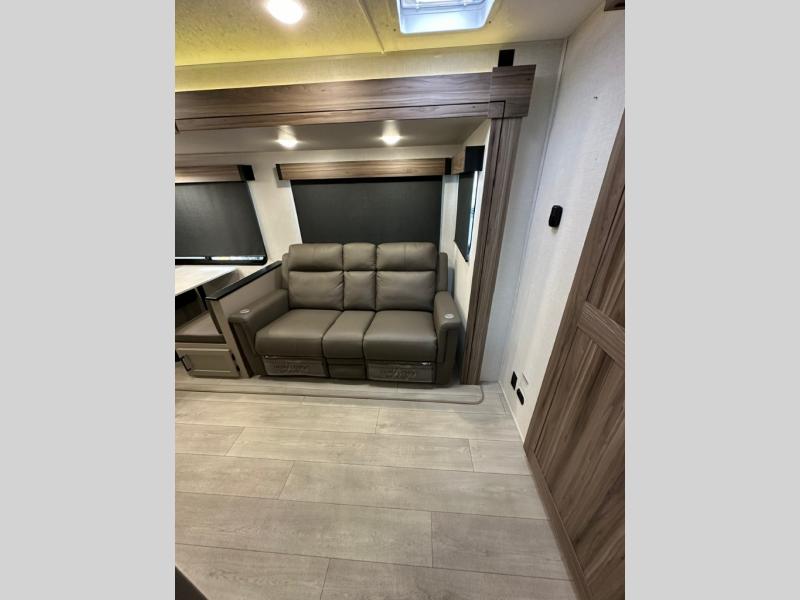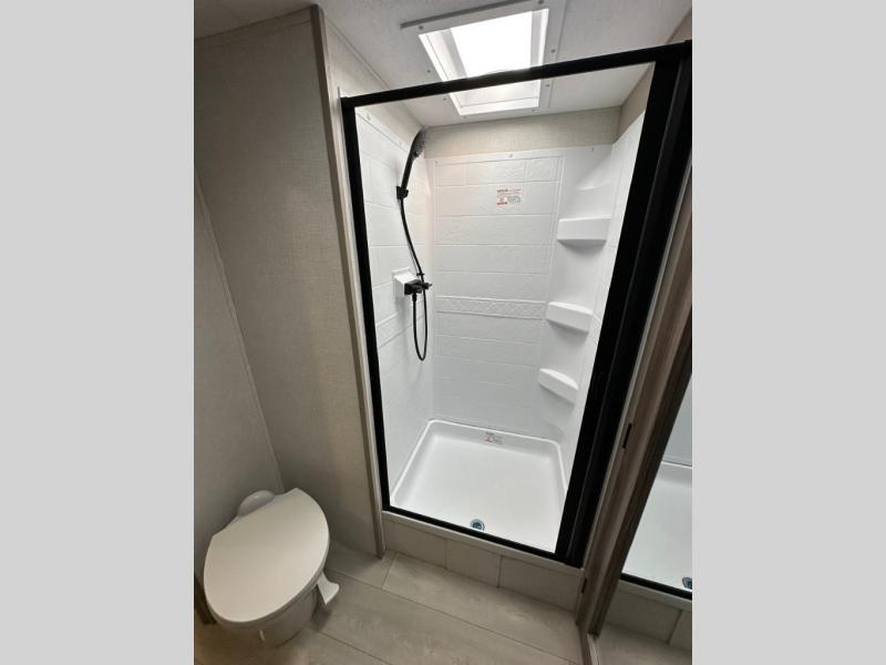 Pack your bags and head to the lake in this cozy travel trailer for five. Once you unload your gear from the pass-through storage, prepare a quick lunch on the mini outside kitchen with a griddle and relax under the patio awning. If the weather is raining on your parade, just head indoors to cook on the three burner cooktop, and you'll find ample counter space in this rear kitchen to set out drinks and sides. Your crew can relax on the hide-a-bed sofa and booth dinette within the large slide out, and there is an LED TV and a 34" fireplace for a more at-home atmosphere. One of your favorite features of this trailer will probably be the master suite with a king bed slide out, a dresser and an entertainment center, plus easy access to the front full bath. Here, you'll find dual bath sinks, a spacious shower, plus a walk-in closet with a closet rod to keep your outfits wrinkle free. There is even a wardrobe in the bedroom with washer and dryer prep so you can keep all those clothes fresh and clean!
