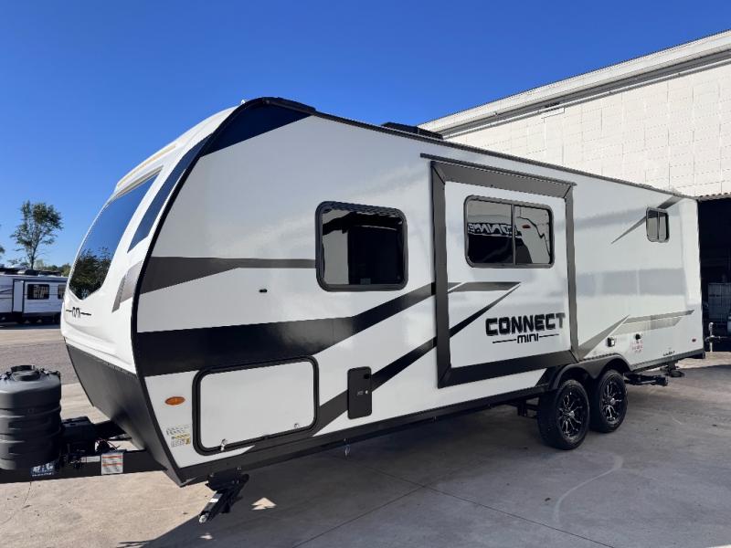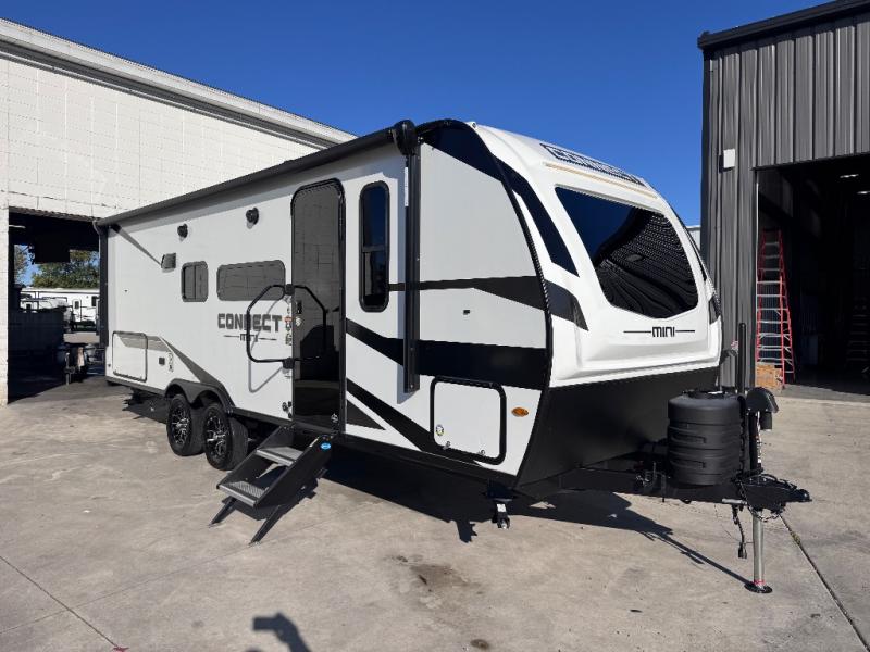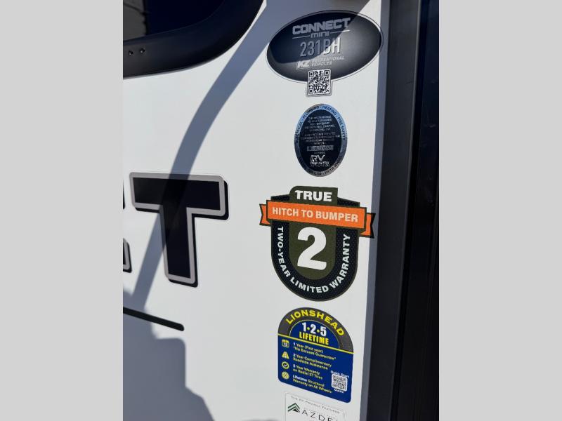 With any Connect Mini travel trailer by KZ, you will enjoy lightweight towing, interior comforts, and a price point you're sure to appreciate. Each model is constructed with durable 1-piece Tufflex material, 5/8" tongue and groove plywood flooring, and a molded fiberglass front cap with a windshield to let of your outdoor views in! You will love the look of the full glass friction hinged entry door, and the power awning with an LED light strip will provide a place to visit outdoors with friends and family. A hot and cold exterior shower also comes standard, along with nitrogen filled tires, a folding grab handle plus roof mounted solar prep and backup camera prep. Head inside to find residential grade linoleum, seamless countertops, roller shades, and painted hardwood cabinet doors. The 42,000 BTU tankless hot water heater will provide endless hot showers, and the low profile 13,500 BTU A/C will keep you comfortable during the summer!