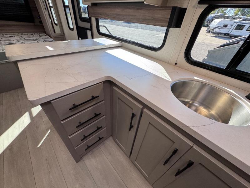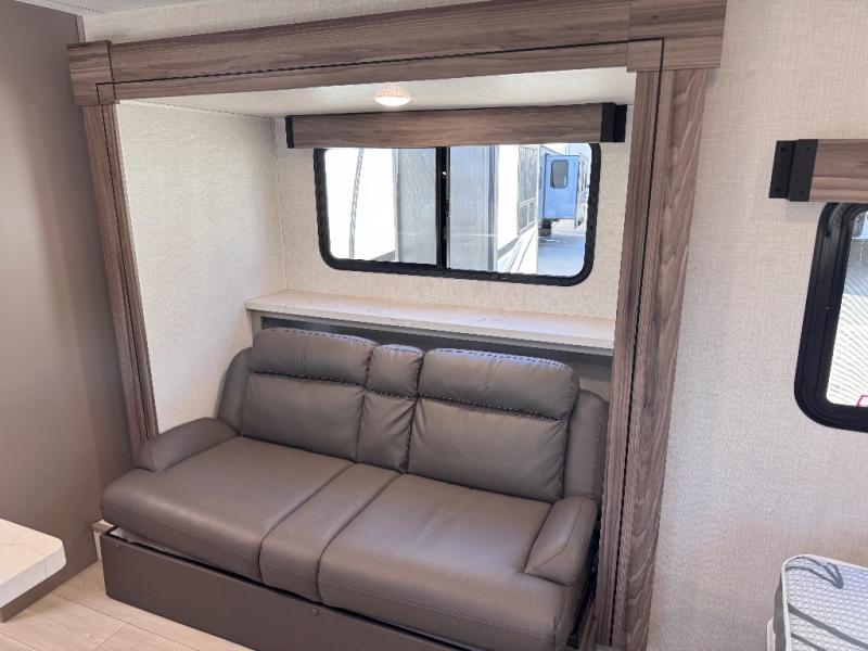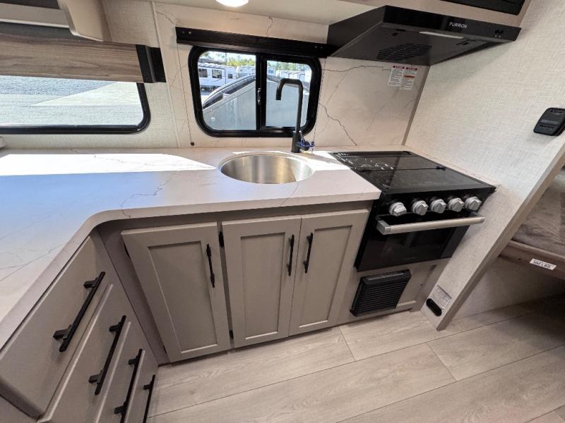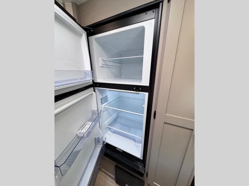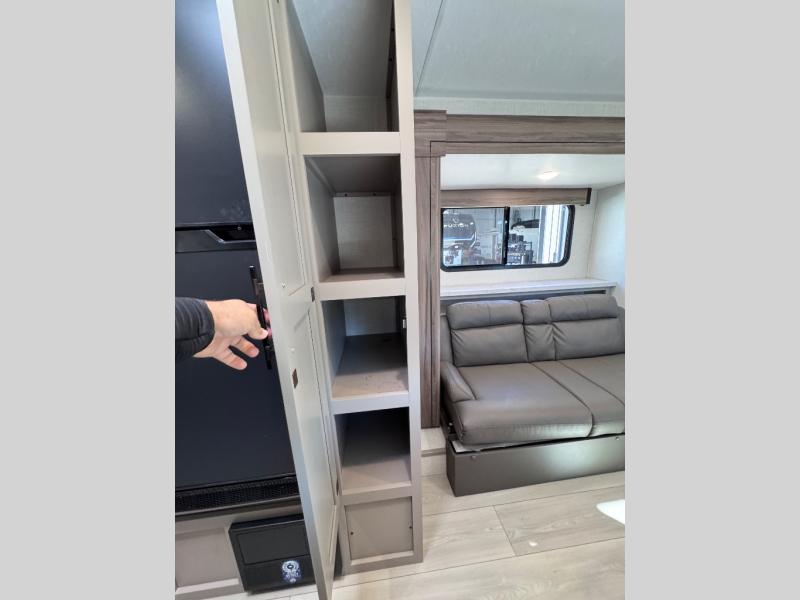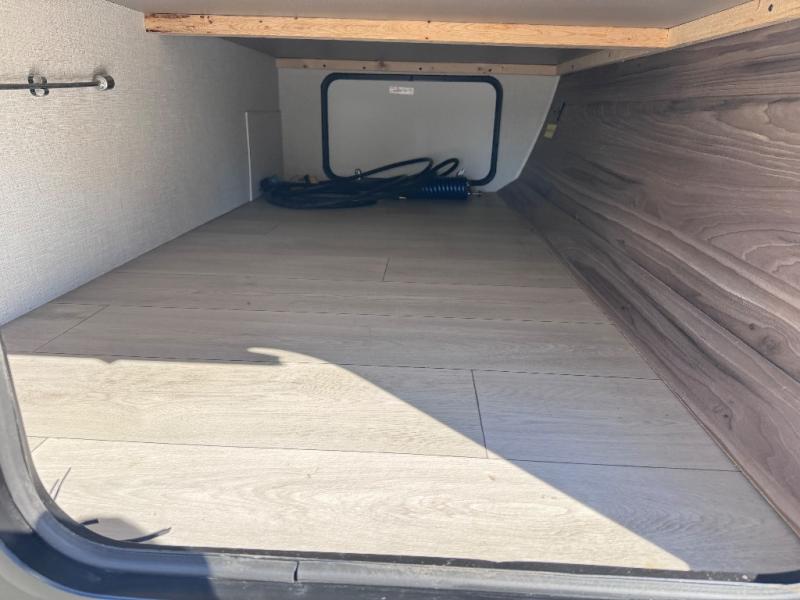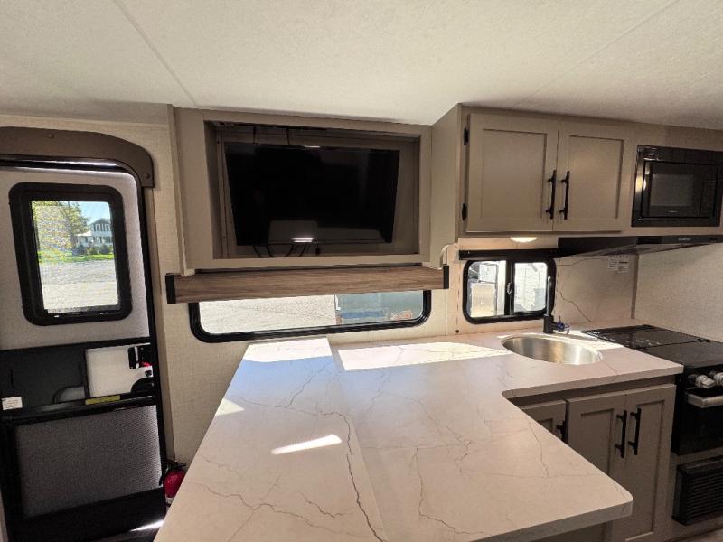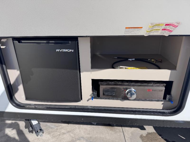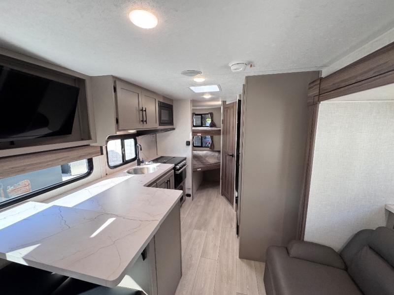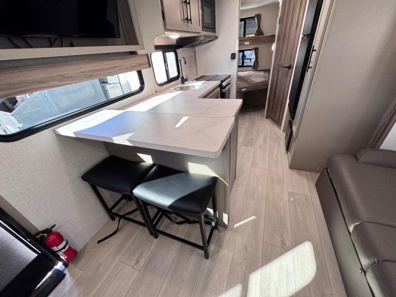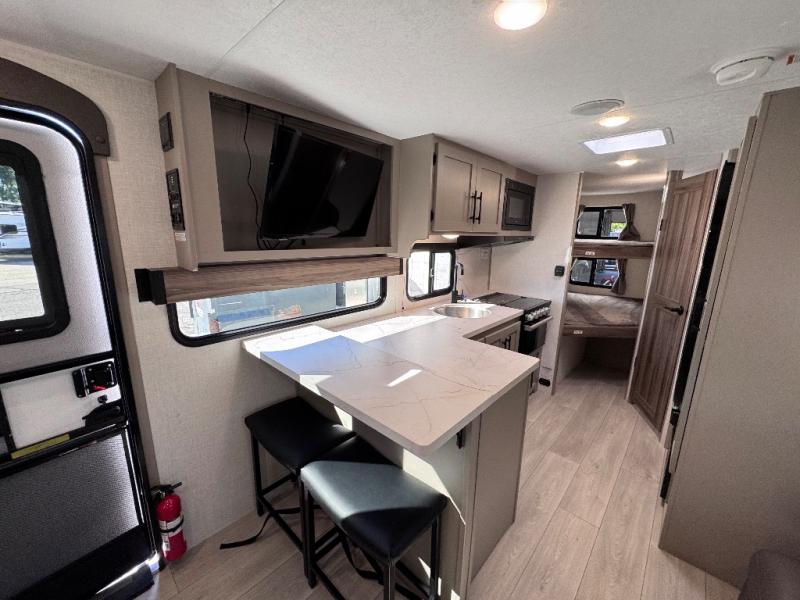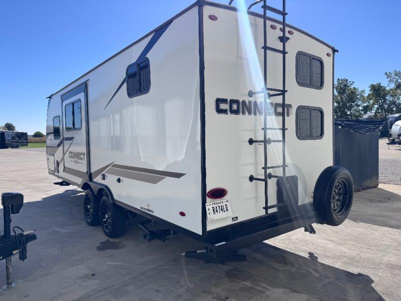 This travel trailer is the biggest in the Connect Mini lineup and you're sure to love it! There are double-size bunks for guests or little ones and a front RV queen bed for you! The slide out with a jackknife sofa and table will provide a place to relax and enjoy a meal together, and there is additional seating at the bar top with two stools. There is plenty of storage space found with this model, including dual bedroom closets, a pass-through storage, plus a pass-thru storage up front for fishing poles, hiking gear, and more! You will also love having an outside kitchen to cook meals when the weather is nice!