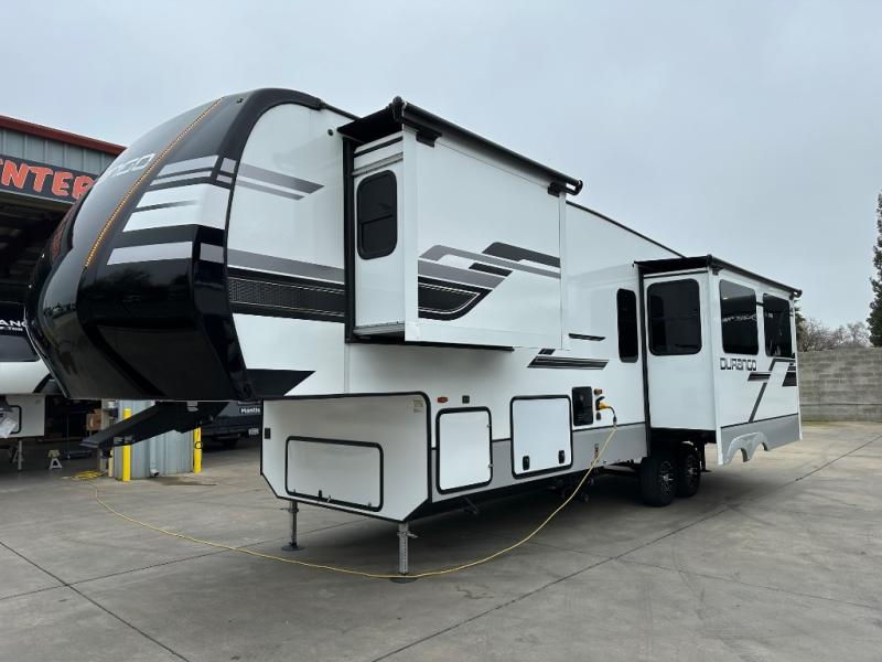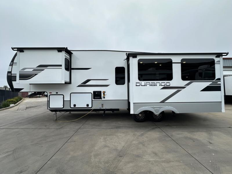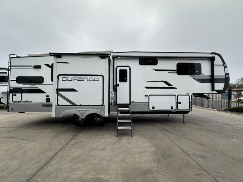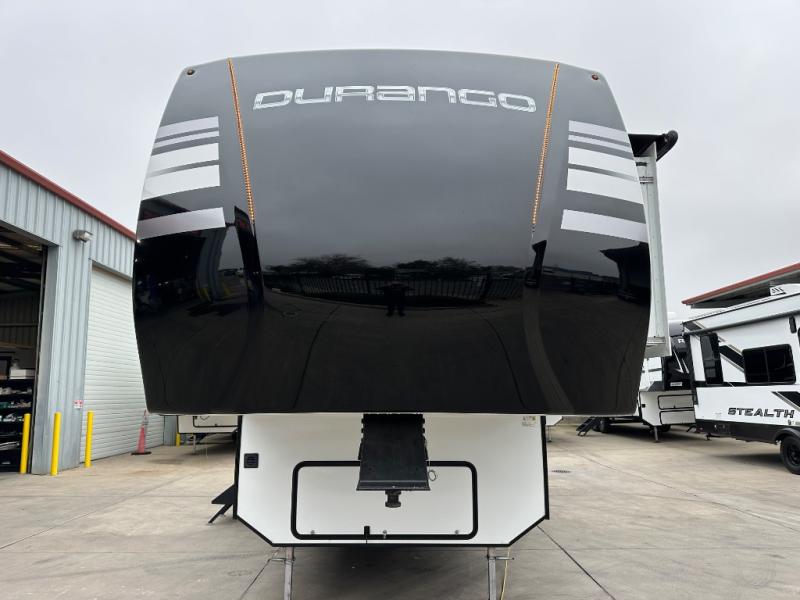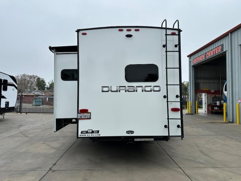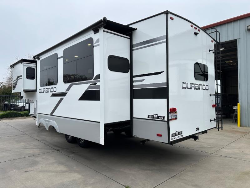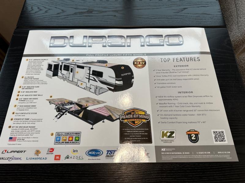 Enjoy full time living, an affordable price, and a wide body construction for more living space with every one of these KZ Durango light high-profile fifth wheels! These luxury units can be used all year round with the all-weather insulation package, the 3" x 14" foam-core in-floor straight-line heating system with a 35,000 BTU furnace, and the 15,000 BTU ducted roof A/C which optimizes the airflow by an average of 40% for better performance, cooling time, and reduction of noise. A few other construction features you will appreciate include a one piece, seamless walk-on Tufflex roofing material, Pex® in-floor heated waterlines, a Lamilux® gelcoat fiberglass exterior, and Dexter® axles with self adjusting brakes and height adjusting hangers. Inside, blancher cherry cabinetry, a king size bed, and smart TVs will have you feeling like you never left home!