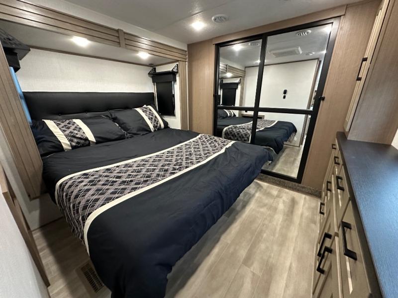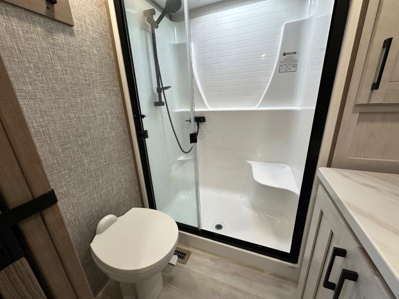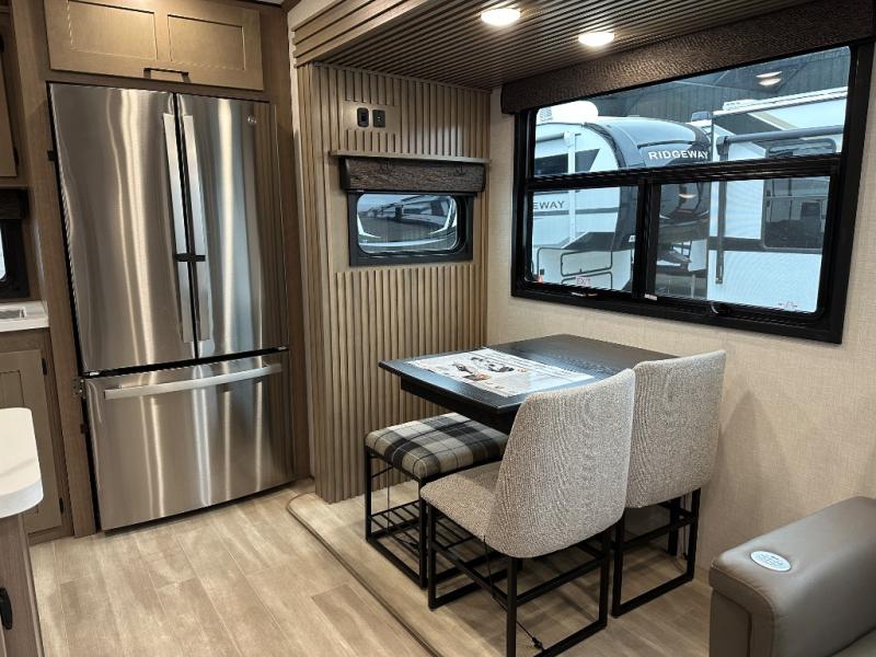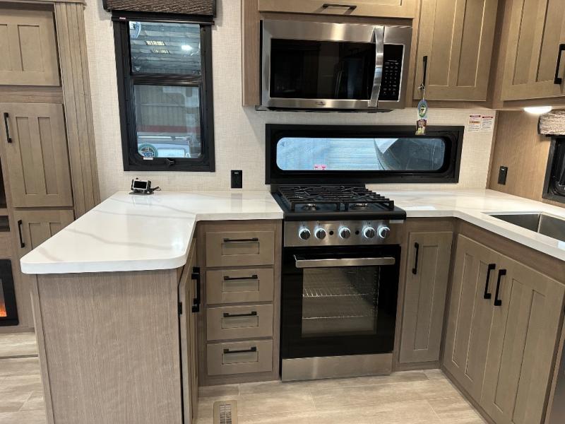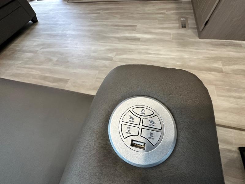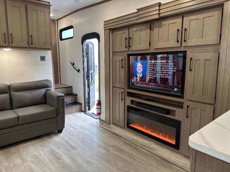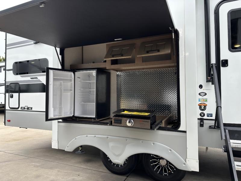 The chef will love cooking in the rear kitchen of this fifth wheel! They could even cook the catch of the day on the outside griddle while enjoying a cold beverage from the refrigerator, plus there is a smart TV at the outside kitchen. You can enjoy your meals at the table and chairs then lay down on the hide-a-bed sofa after stuffing yourself full. The theater seating with USB charging also offers a comfortable place to relax in front of the 40" fireplace at the entertainment center. Freshen up each morning in the full bathroom with the 48" x 30" residential shower with a seat and easily grab your towel from the linen closet next to it. When you're ready to wind down your nights, head to the front private bedroom to change into your pajamas stored in the dresser or from the front wardrobe with washer and dryer prep. There is also a king bed slide out or you can choose the optional queen bed if you want more floor space.