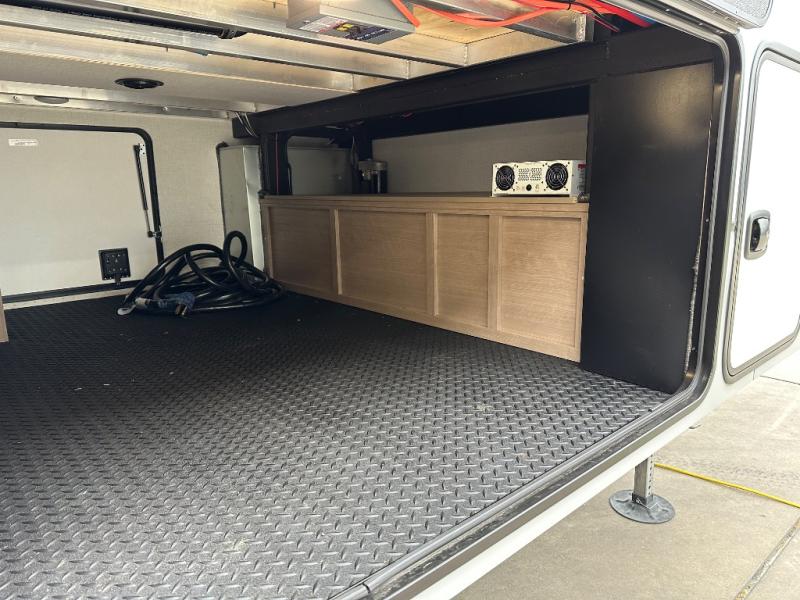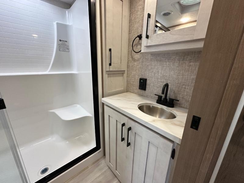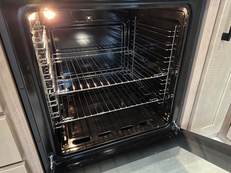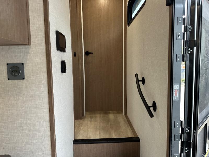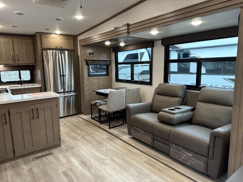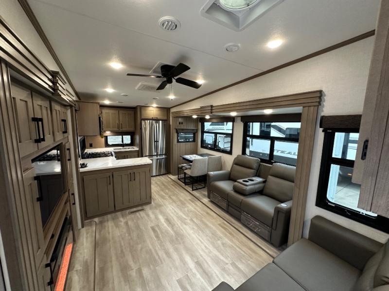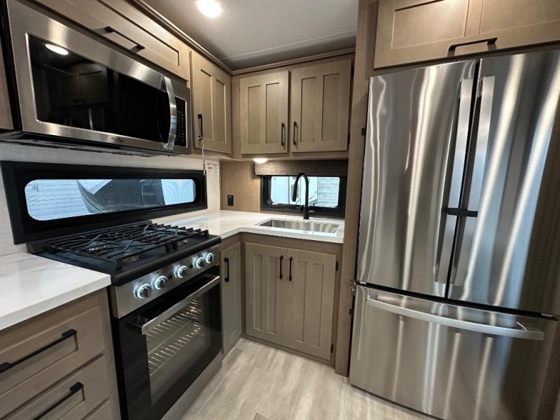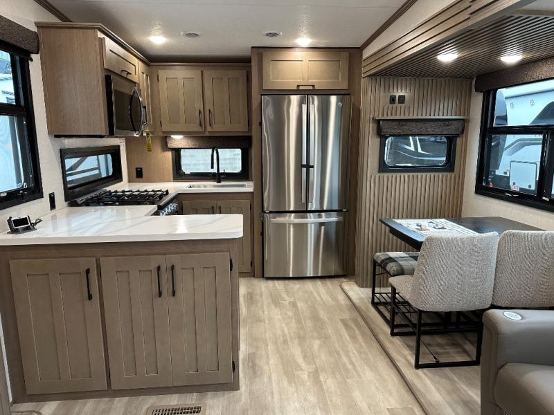 The chef will love cooking in the rear kitchen of this fifth wheel! They could even cook the catch of the day on the outside griddle while enjoying a cold beverage from the refrigerator, plus there is a smart TV at the outside kitchen. You can enjoy your meals at the table and chairs then lay down on the hide-a-bed sofa after stuffing yourself full. The theater seating with USB charging also offers a comfortable place to relax in front of the 40" fireplace at the entertainment center. Freshen up each morning in the full bathroom with the 48" x 30" residential shower with a seat and easily grab your towel from the linen closet next to it. When you're ready to wind down your nights, head to the front private bedroom to change into your pajamas stored in the dresser or from the front wardrobe with washer and dryer prep. There is also a king bed slide out or you can choose the optional queen bed if you want more floor space.