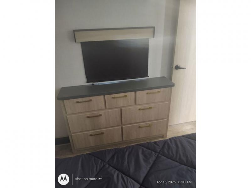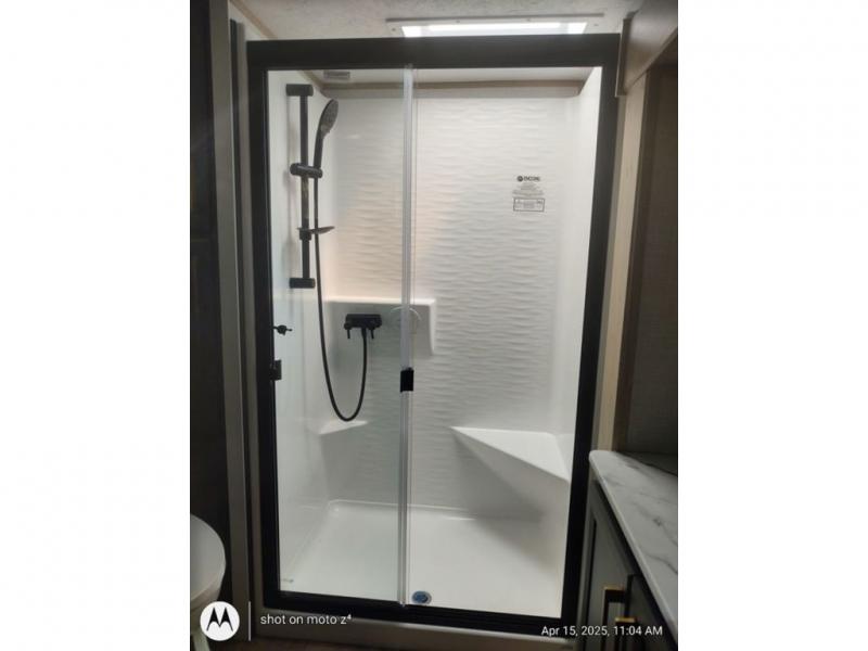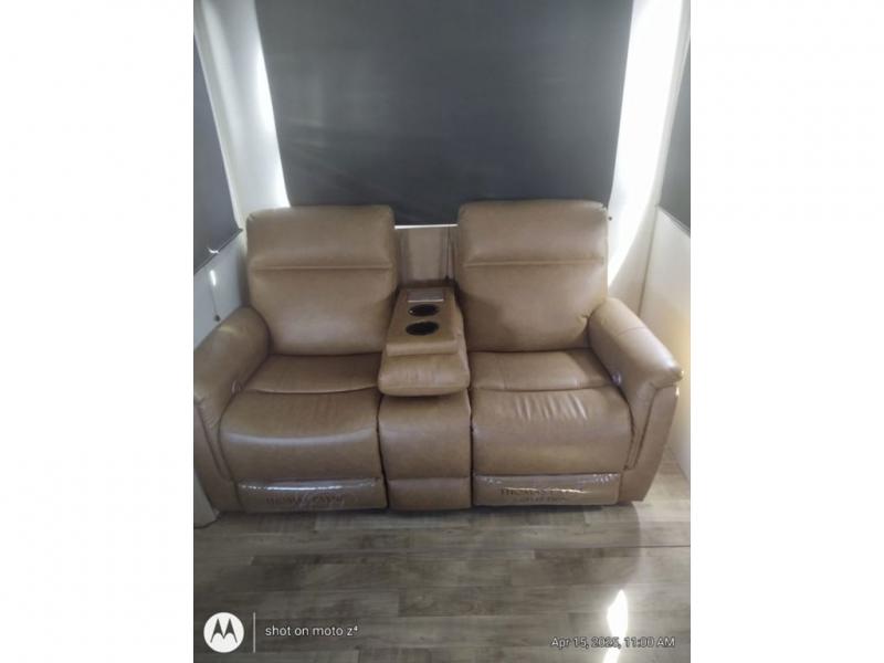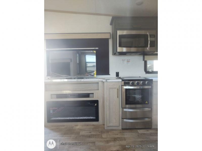 When you want to get away from it all, hitch up this spacious fifth wheel and head out! Once you arrive at the campground, you can make lunch in the rear kitchen that includes ample counter space, a 21" oven and 30" microwave, plus a pantry and French door refrigerator for food storage. Your crew can relax at the L-dinette with an EZ adjust table or on the theater seating across from the fireplace and Smart LED TV. And if you're needing additional sleeping space, just choose the optional hide-a-bed sofa in place of the theater seating! The dual entry bath features a spacious 42" x 30" residential shower, convenient towel hooks and a large slide out that is shared with the front master bedroom. You'll sleep soundly on the king bed here, and you can keep your things organized in the dresser and front closet. There is also washer and dryer prep if you want to add those appliances!