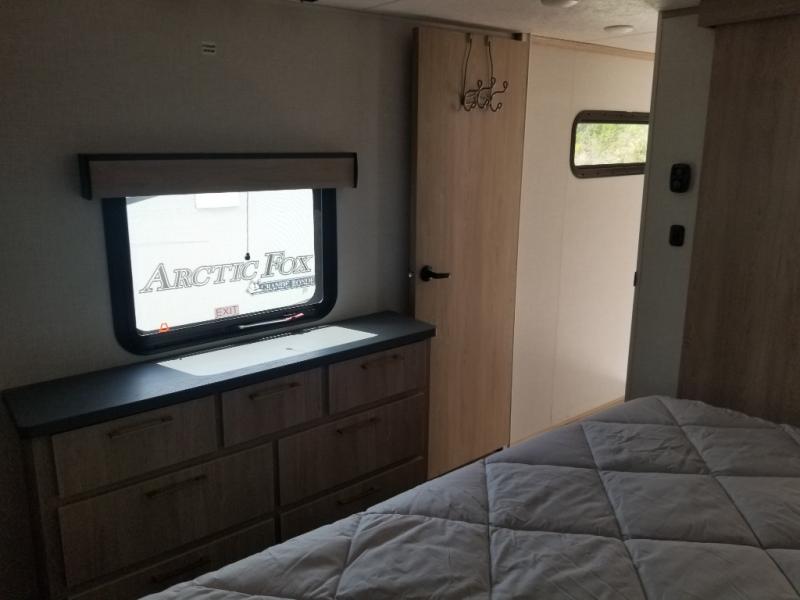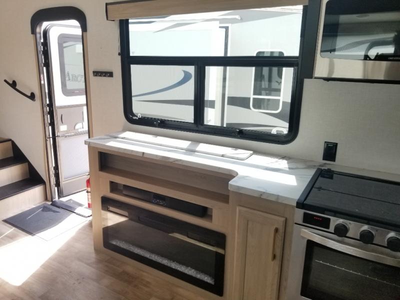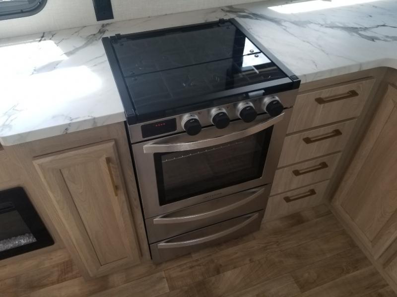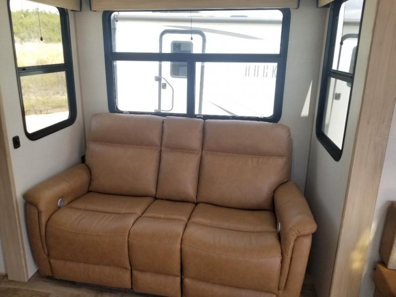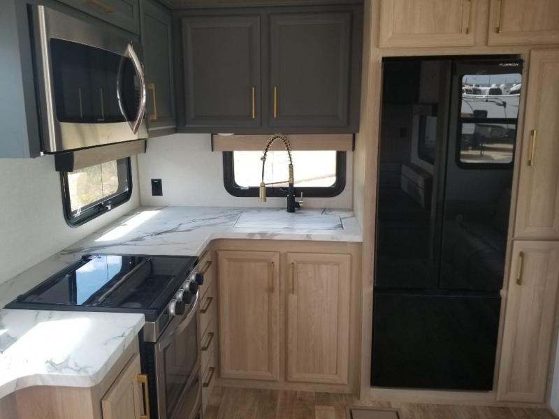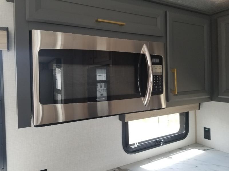 When you want to get away from it all, hitch up this spacious fifth wheel and head out! Once you arrive at the campground, you can make lunch in the rear kitchen that includes ample counter space, a 21" oven and 30" microwave, plus a pantry and French door refrigerator for food storage. Your crew can relax at the L-dinette with an EZ adjust table or on the theater seating across from the fireplace and Smart LED TV. And if you're needing additional sleeping space, just choose the optional hide-a-bed sofa in place of the theater seating! The dual entry bath features a spacious 42" x 30" residential shower, convenient towel hooks and a large slide out that is shared with the front master bedroom. You'll sleep soundly on the king bed here, and you can keep your things organized in the dresser and front closet. There is also washer and dryer prep if you want to add those appliances!