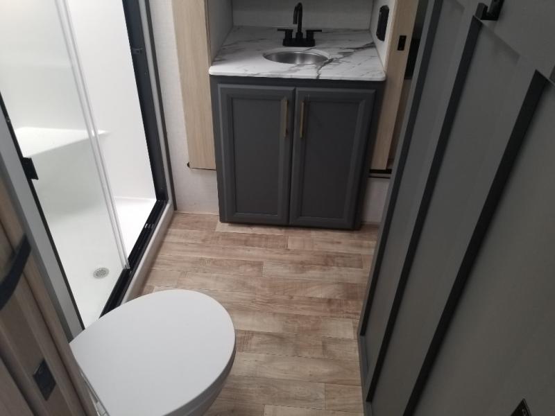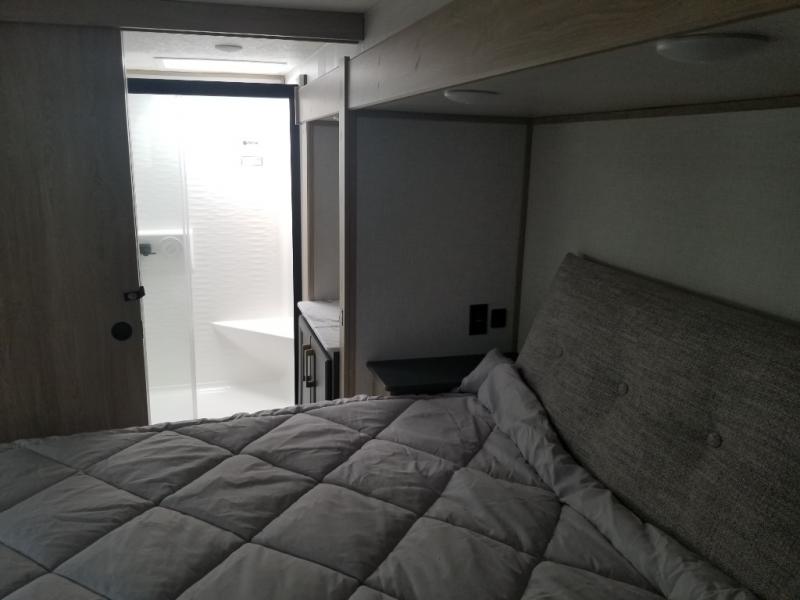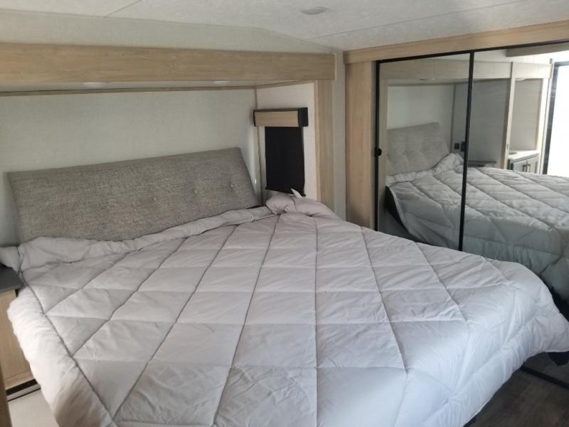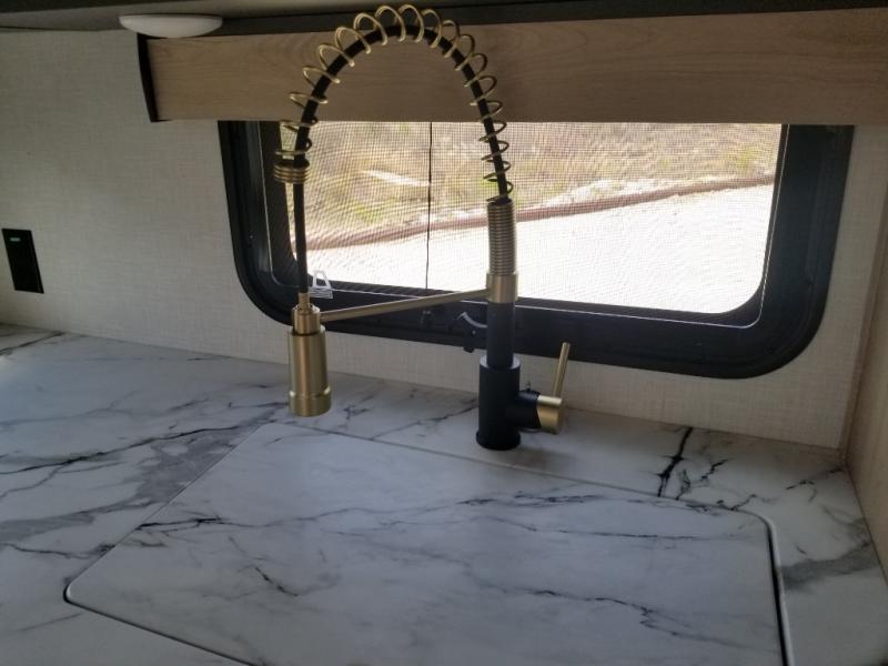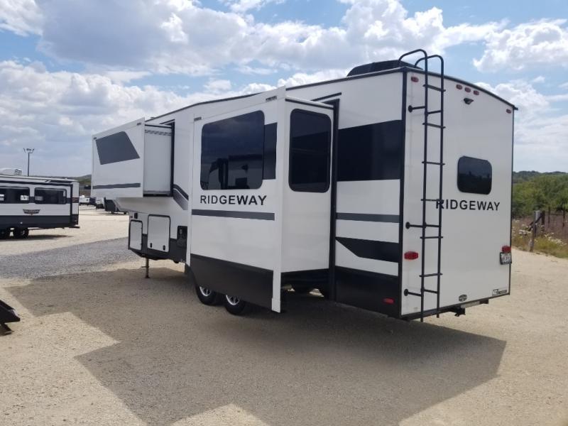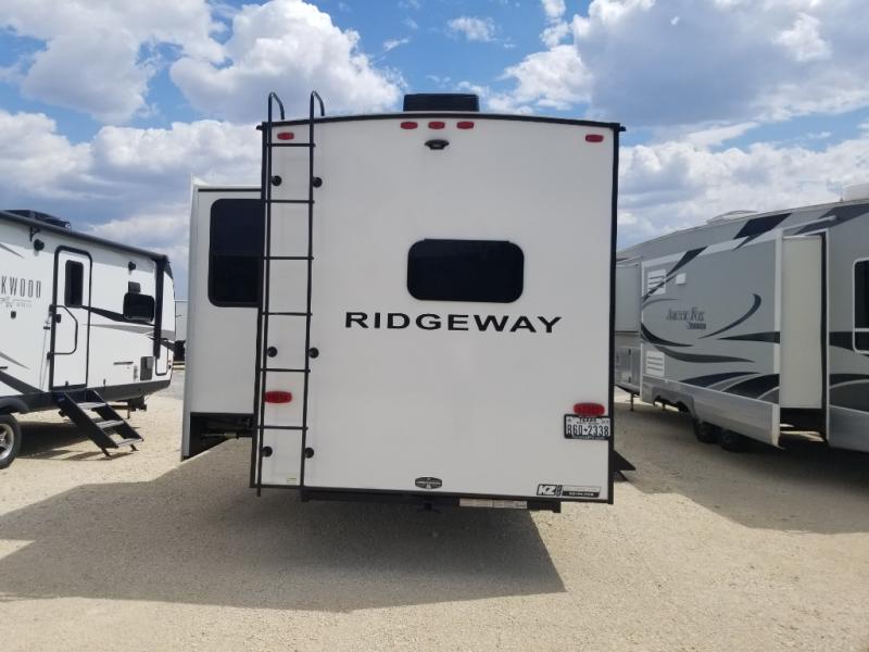When you choose a Ridgeway fifth wheel by KZ you are choosing a modern design, convenient features, and comfort at every turn! These units have been constructed with some of the most durable materials in the industry, including Azdel composite panels and Tufflex roofing material. The exterior includes a full painted front cap, a fully-finished, heated and sealed basement storage compartment, and a deluxe heated water convenience center to easily monitor your units water levels. There is also 4-point auto electric leveling, Keyed-Alike for baggage and entry doors, a 2" towing receiver hitch, and many more stand-out exterior features. Once inside, you'll enjoy the ceiling crown molding, 5" gold cabinet hardware, deluxe residential-style furniture, and all-wood lumber core screwed cabinets with hardwood doors. The comforts continue on in the bathroom and bedroom with a shower skylight and built-in seat, large linen closets, a luxurious bedspread, and XL under-bed storage for luggage, extra blankets and more!