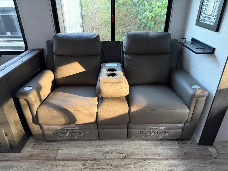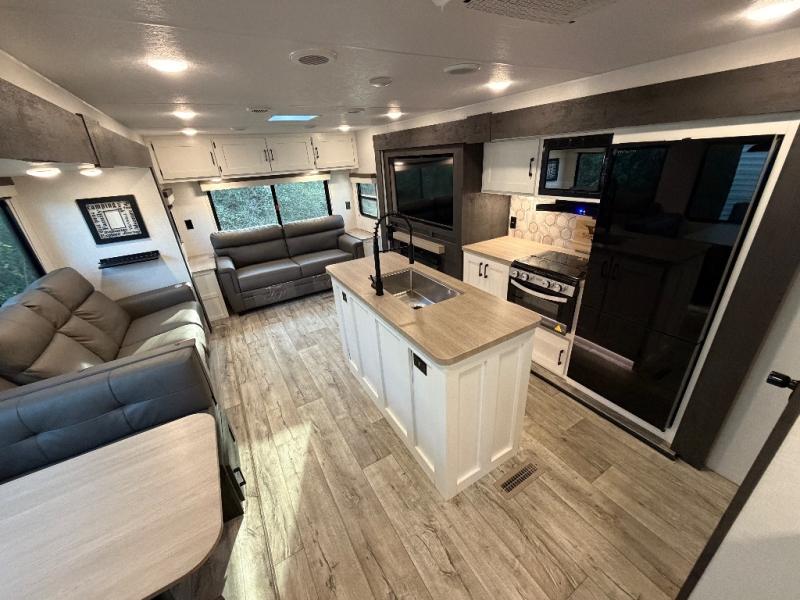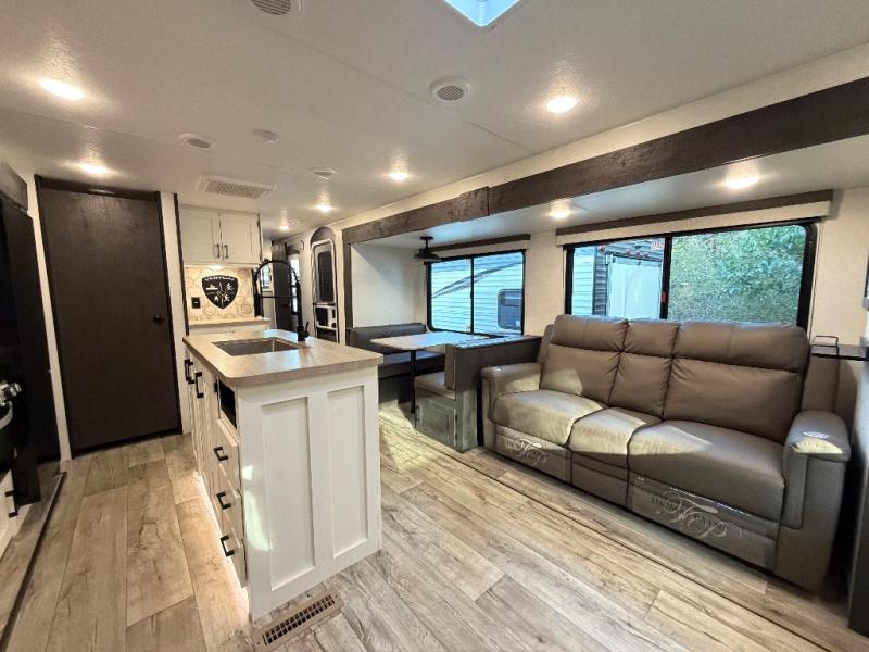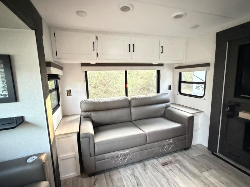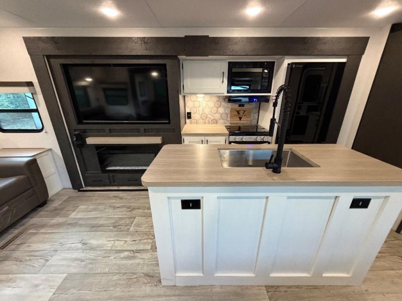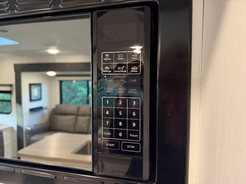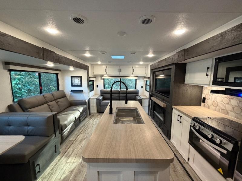 This travel trailer will feel just like home thanks to its spacious interior, large front private bedroom, and kitchen island. There are plenty of places to seating space, including a rear 70" sofa plus theater seating and a Sit N' Slide table within one of the slides. The opposing slide here includes the entertainment center and some of the kitchen appliances. You will also appreciate two pantries, one with washer and dryer prep if you want to add those appliances. A full bath lets you stay clean throughout your trip without having to use the campground's facilities, and the front bedroom is sure to make you feel at home. There is a Sleep Tight queen bed slide, a large front closet, plus a dresser and a second closet for ample storage space!