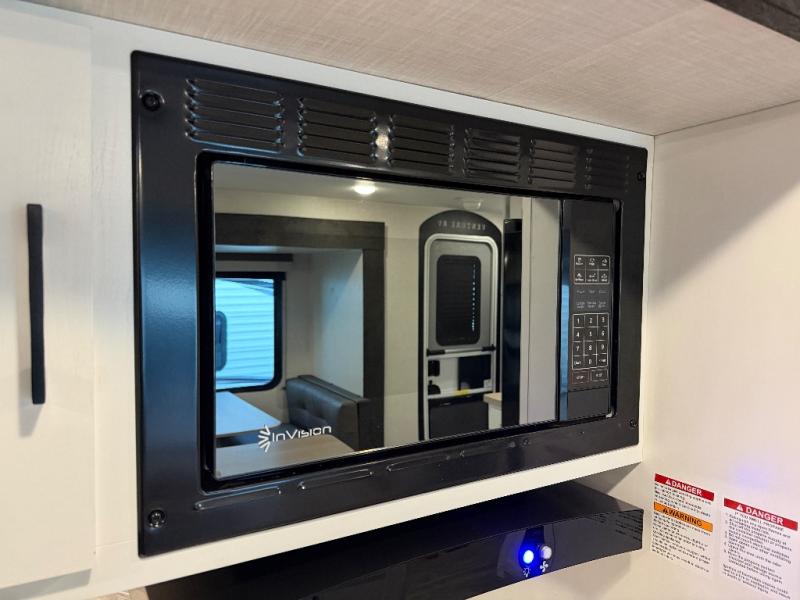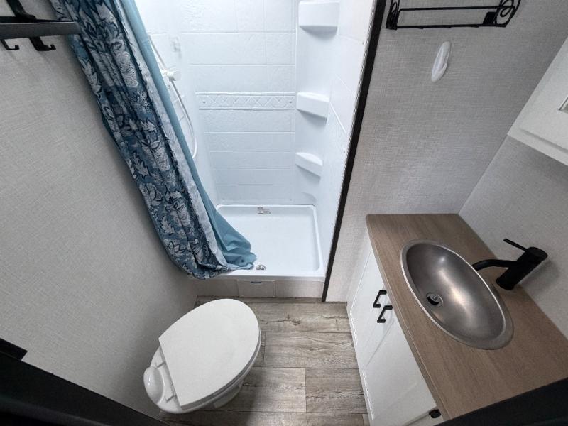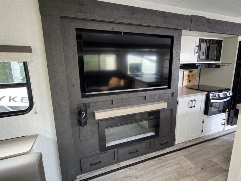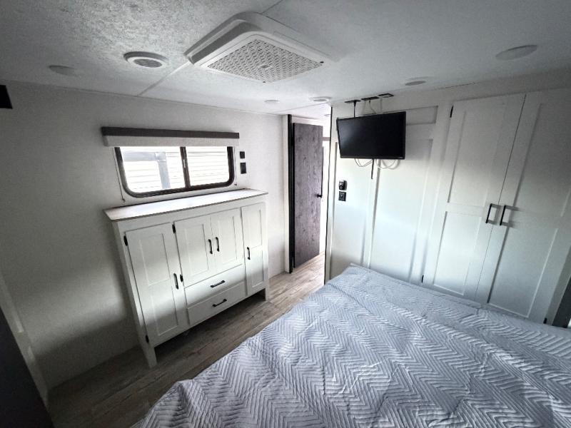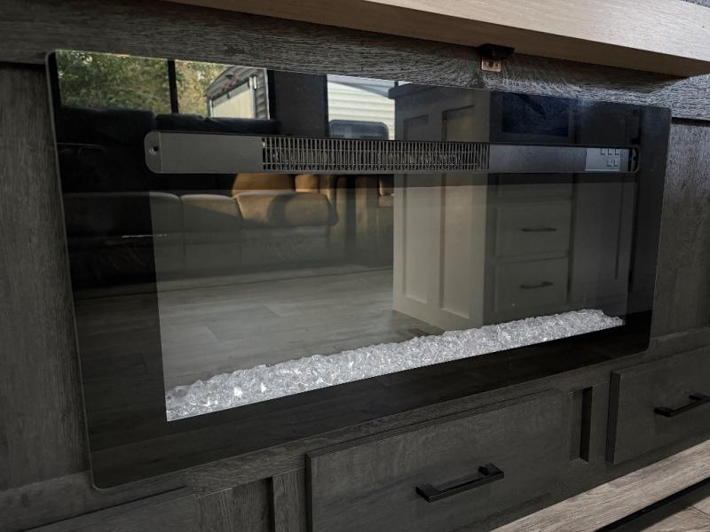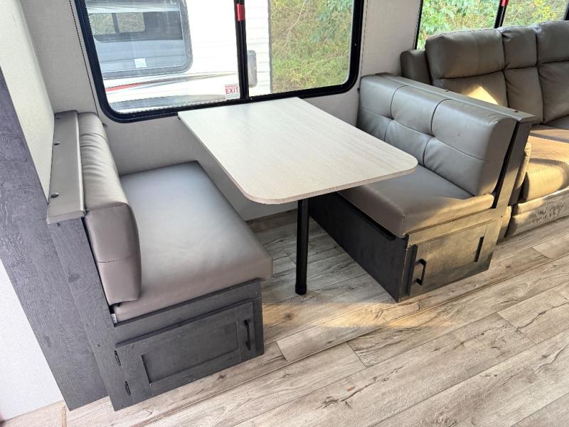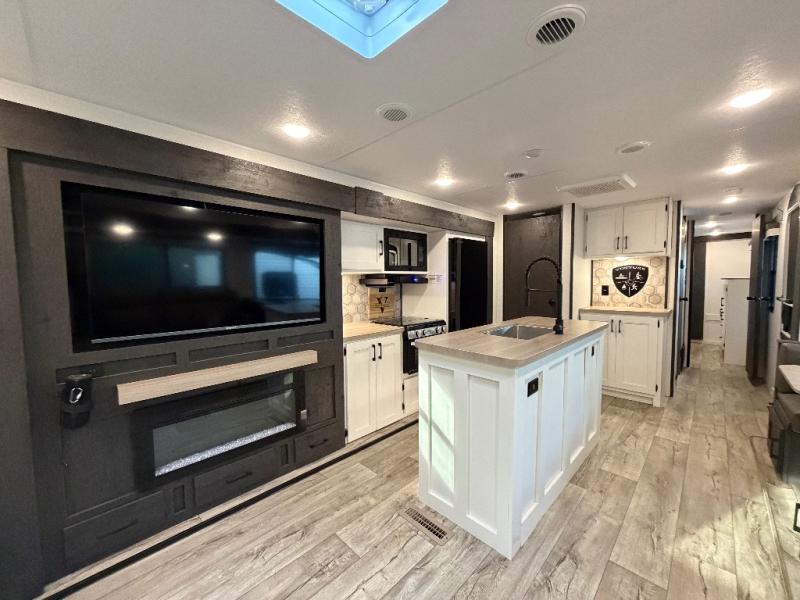 This travel trailer will feel just like home thanks to its spacious interior, large front private bedroom, and kitchen island. There are plenty of places to seating space, including a rear 70" sofa plus theater seating and a Sit N' Slide table within one of the slides. The opposing slide here includes the entertainment center and some of the kitchen appliances. You will also appreciate two pantries, one with washer and dryer prep if you want to add those appliances. A full bath lets you stay clean throughout your trip without having to use the campground's facilities, and the front bedroom is sure to make you feel at home. There is a Sleep Tight queen bed slide, a large front closet, plus a dresser and a second closet for ample storage space!