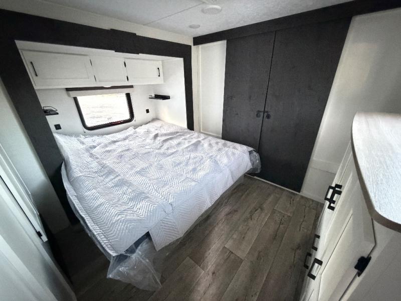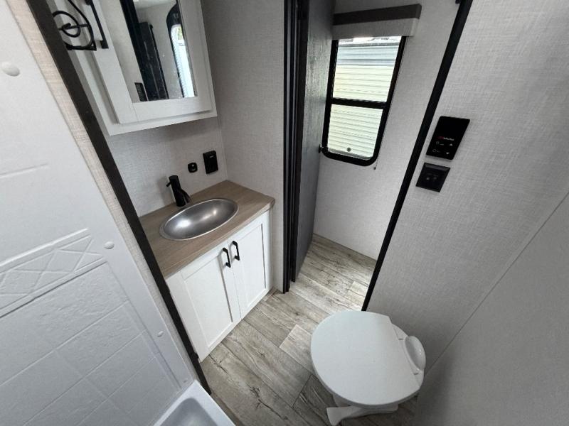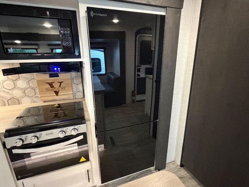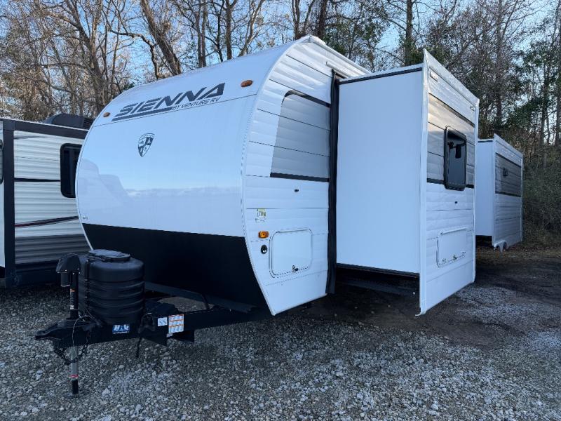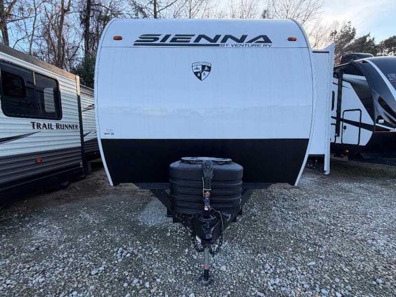 With any Sienna travel trailer by Venture RV, you will enjoy a lightweight unit, convenient amenities, and a durable construction that includes a BAL NXG-bolted frame. There is also a heated and enclosed one-piece underbelly, residential fiberglass insulation, and a reflective PVC roof membrane within the Weather-Shield Package to help extend your camping season. Outside, the BAL 5.0 power stabilizer jacks and power tongue jack will have you set up in no-time, and the Venture RV bottle opener/dog tie down will make it easy to bring your furry friends along. Head inside to enjoy the modern farmhouse design, along with Beauflor throughout with no carpet, custom backsplash, large underbed storage, and a bath skylight to name a few comforts!