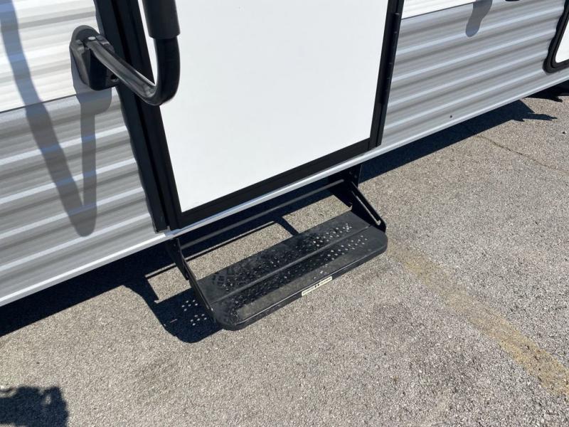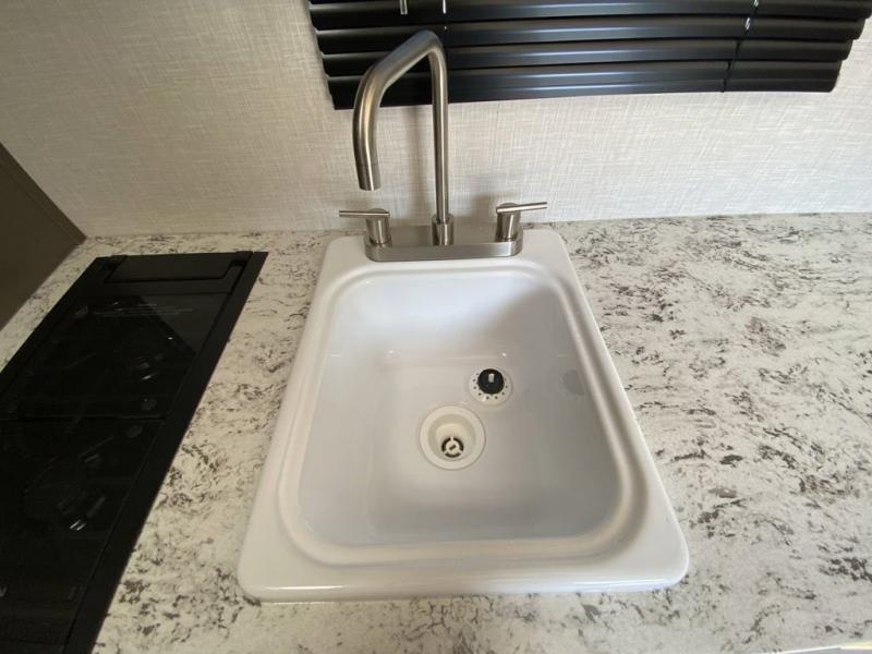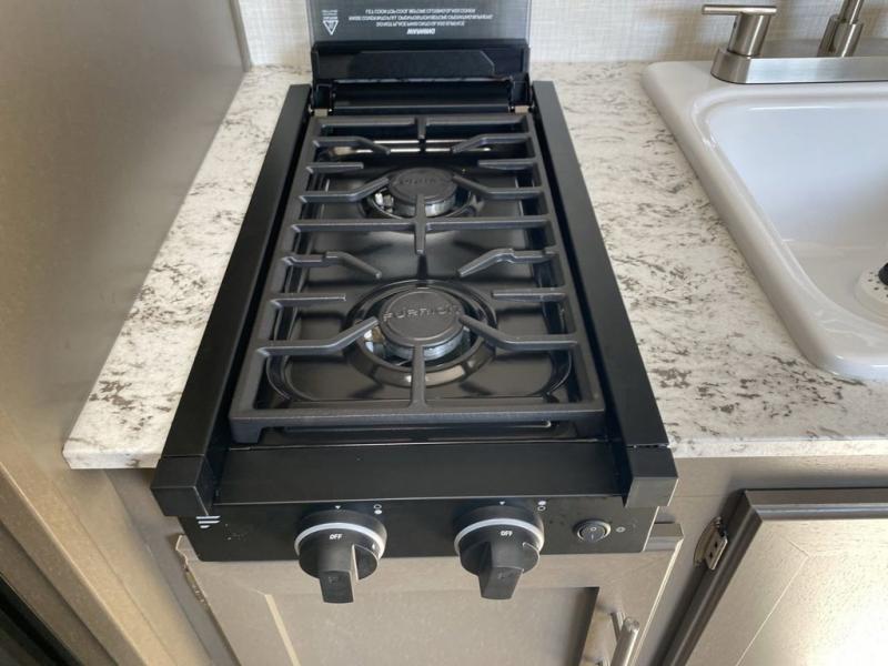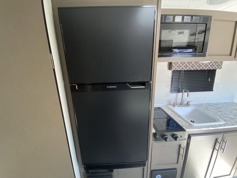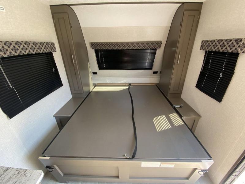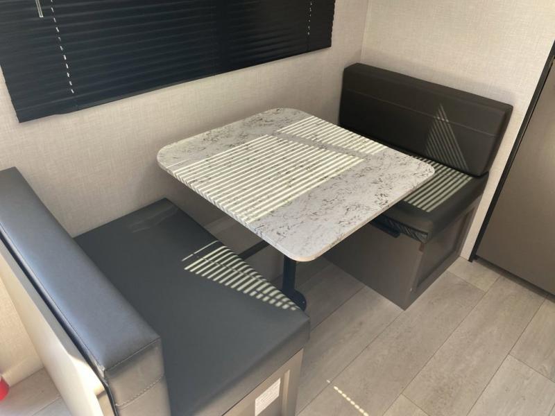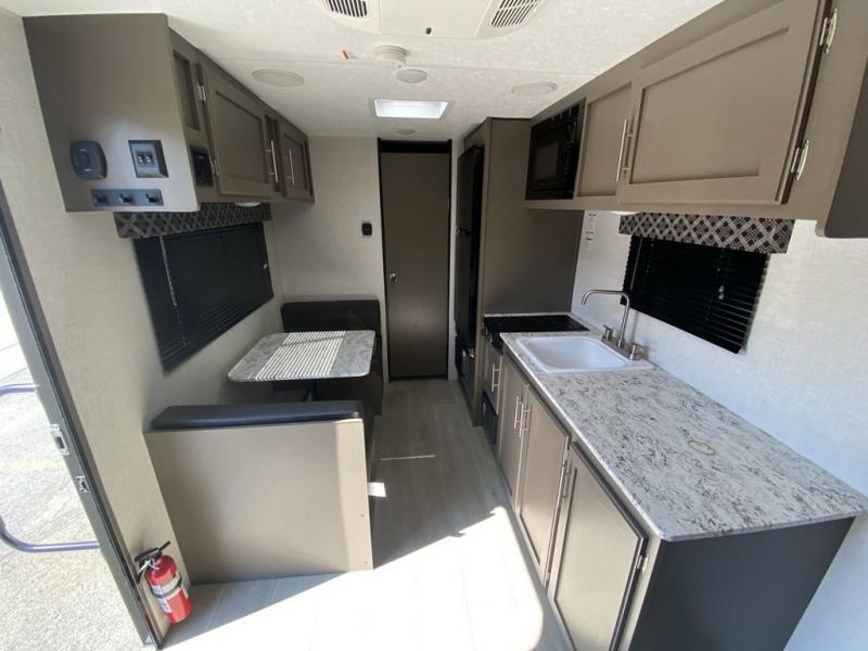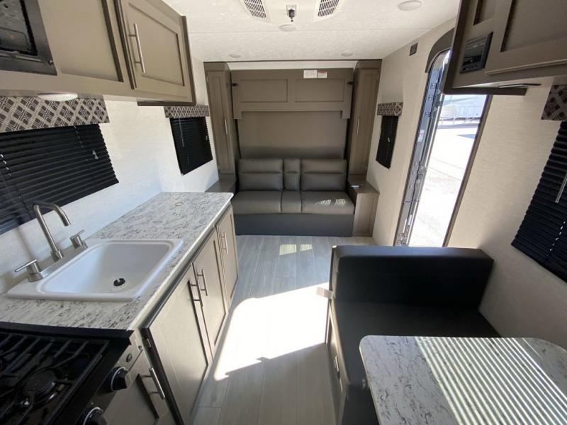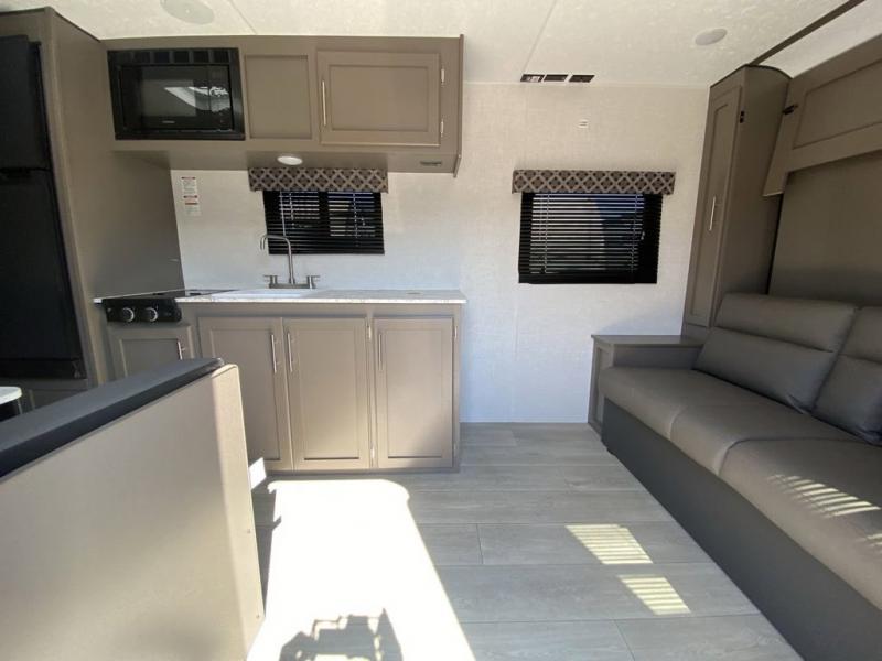 This versatile travel trailer is perfect for weekend trips to the lake. You'll sleep soundly each night on the 60" x 74" mattress, and there are dual bedside wardrobes to keep your things tidy. This model also includes a booth dinette that can be used for dining and sleeping space. The chef of your group can prepare meals on the two burner cooktop with a glass cover, and leftovers can go in the 8 cu. ft. 12V refrigerator. This model also includes a 12' power awning that will provide shade while you're outdoors as well.