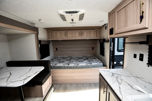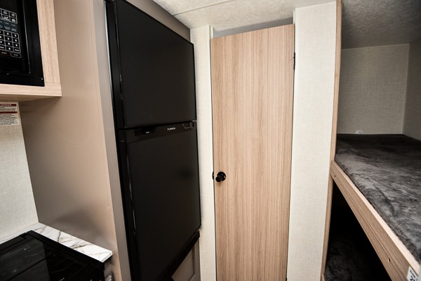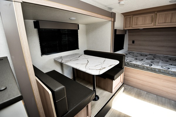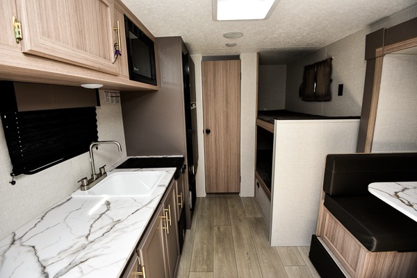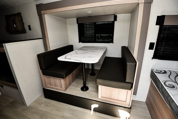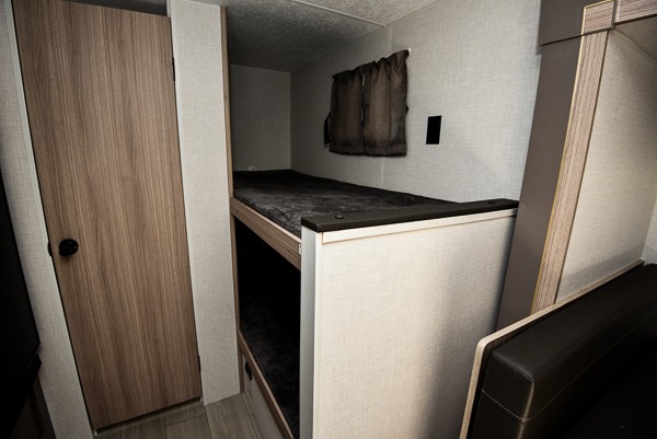 You can easily sleep five with this travel trailer thanks to the bunk beds, the front bed, and the booth dinette slide out. Whip up breakfast on the two burner cooktop with a glass cover, or use the convenient microwave oven. The 8 cu. ft. 12V refrigerator will store your perishables, and the single bowl sink allows you to keep everything clean. Start camping today with this cozy travel trailer!