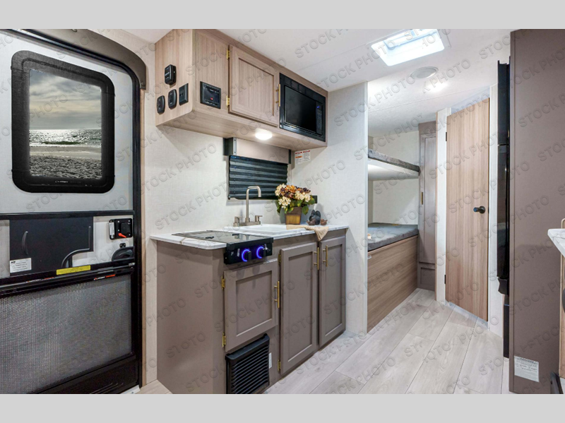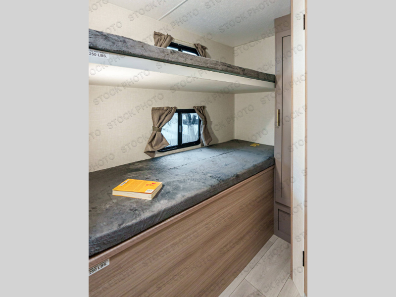 You're going to love camping in this spacious travel trailer that can sleep five people each night. When you arrive at your destination, set up the 14' power awning and start lunch on the outside kitchen with a griddle. The little ones will love the bunk beds, and you will have the front queen bed all to yourselves. This model also includes a full bath that will allow you to stay clean!