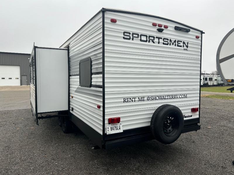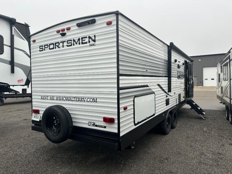 Each Sportsmen SE travel trailer and toy hauler by KZ is constructed with KZ exclusive tough shield exterior metal, a one-piece seamless walk-on Tufflex roofing material, and diamond plate rock guard to protect your unit from road debris. You will appreciate the extra large baggage doors for stowing away your gear when not in use, and tinted windows to help keep the harmful sun rays out plus keeping it cooler inside. Some of the exterior conveniences found in the mandatory Advantage Package are the solid folding steps with a large folding grab handle for easy entry and exit, a full glass friction hinged entry door, plus an exterior shower for your pets or to rinse off before you head inside. You'll also appreciate the nitrogen-filled tires, solar and backup camera prep, plus a Leash Latch with a bonus beverage opener. You'll feel right at home inside with linoleum flooring throughout, a 13,500 BTU air conditioner, large overhead cabinets, a shower surround, and much more!
