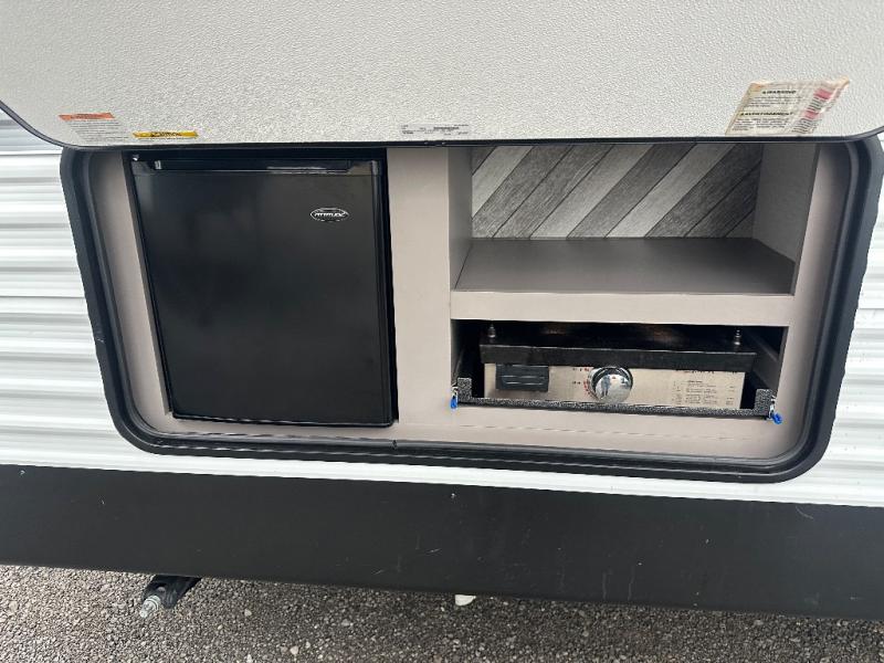Escape to the lake in this spacious travel trailer that can sleep nine to ten people each night! There is a private bunkhouse with four bunks, a front bedroom with a queen bed, plus a U-shaped dinette and a sofa that can sleep everyone. The chef of your group will love the outdoor kitchen with its griddle and refrigerator, and there is a 16' power awning where everyone can visit under while they're waiting for lunch. This model also includes plenty of storage, including a pass-through compartment and an exterior storage door for tackle boxes or tools!