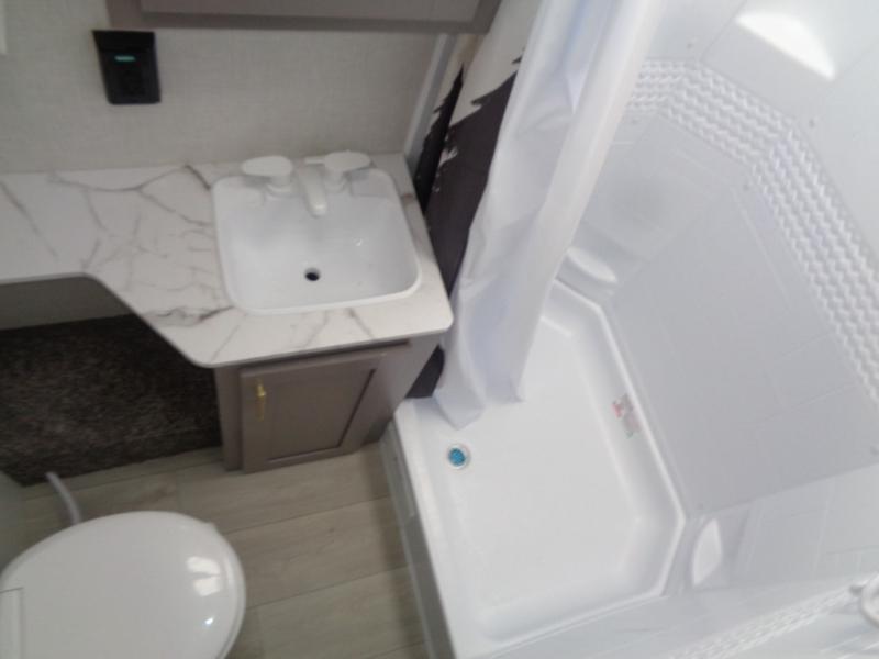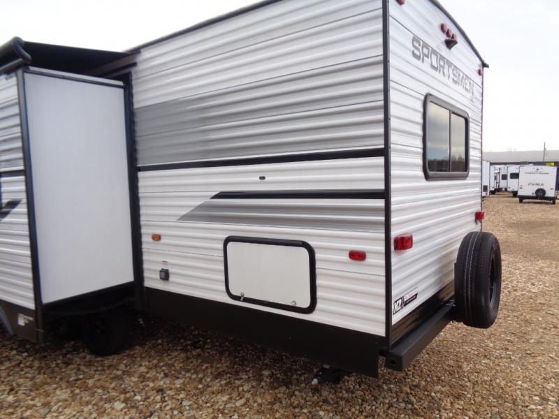 Each Sportsmen SE travel trailer and toy hauler by KZ is constructed with KZ exclusive tough shield exterior metal, a one-piece seamless walk-on Tufflex roofing material, and diamond plate rock guard to protect your unit from road debris. You will appreciate the extra large baggage doors for stowing away your gear when not in use, and tinted windows to help keep the harmful sun rays out plus keeping it cooler inside. Some of the exterior conveniences found in the mandatory Advantage Package are the solid folding steps with a large folding grab handle for easy entry and exit, a full glass friction hinged entry door, plus an exterior shower for your pets or to rinse off before you head inside. You'll also appreciate the nitrogen-filled tires, solar and backup camera prep, plus a Leash Latch with a bonus beverage opener. You'll feel right at home inside with linoleum flooring throughout, a 13,500 BTU air conditioner, large overhead cabinets, a shower surround, and much more!