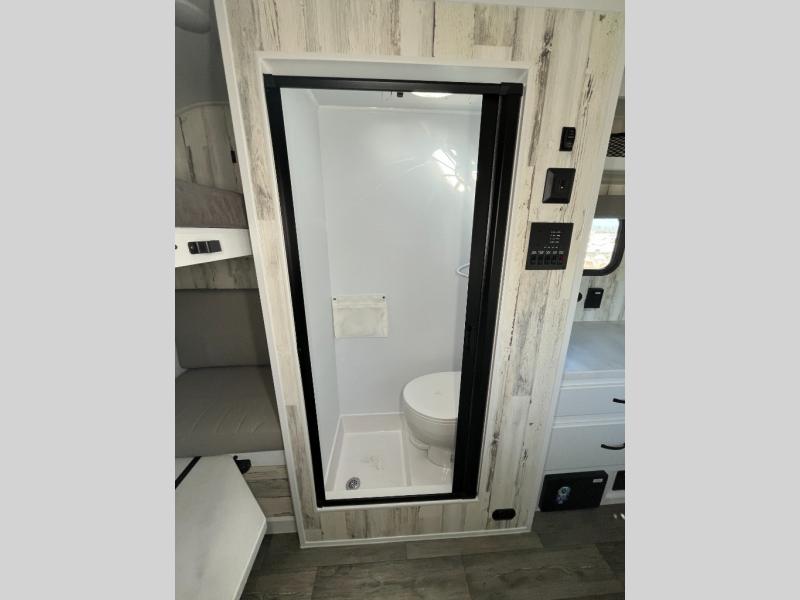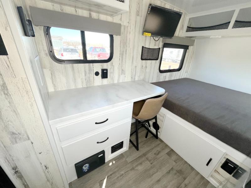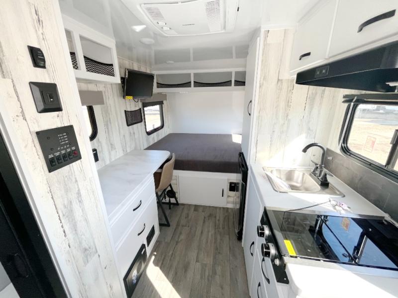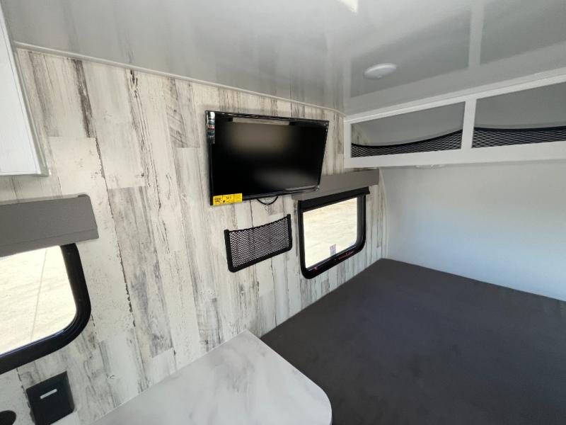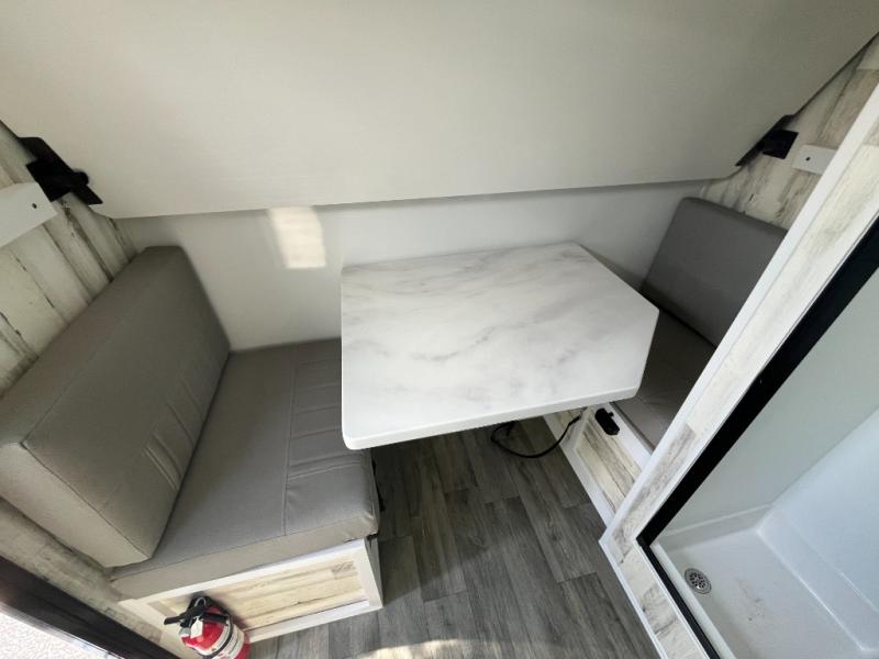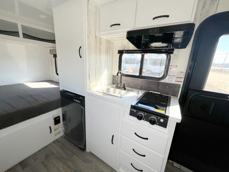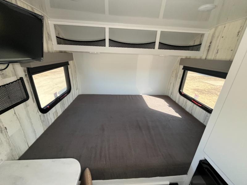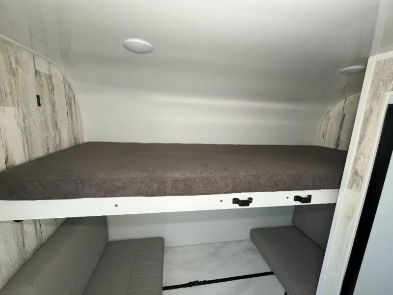 If you're looking for a lightweight trailer with a little more comfort, take a look at this one! There is a 60" x 79" bed to sleep on each night, along with a booth dinette that converts to a 78" x 30" bed and an upper 78" x 27" bunk, allowing you to sleep five to six! The kitchen includes a two burner stove, countertop and 12V refrigerator to keep food fresh. This unit also features four front side windows, black roller shades, a 24" 12V HDTV, and many more comforts!