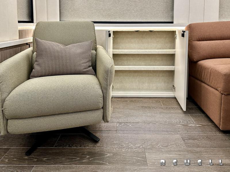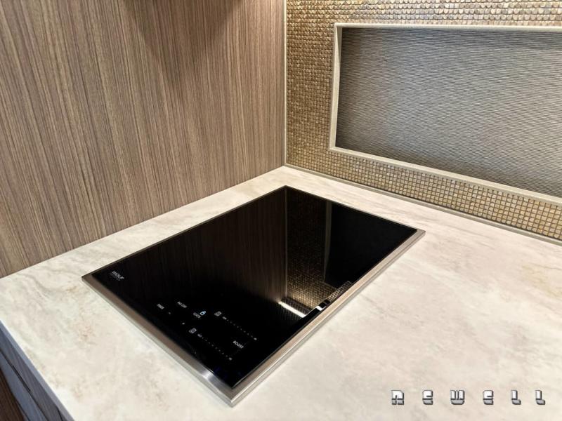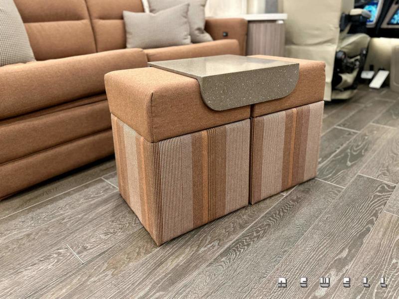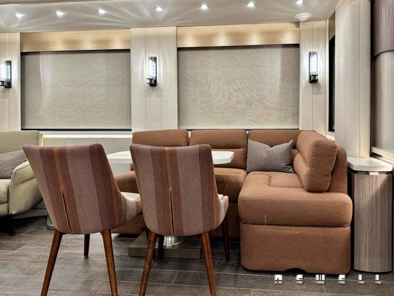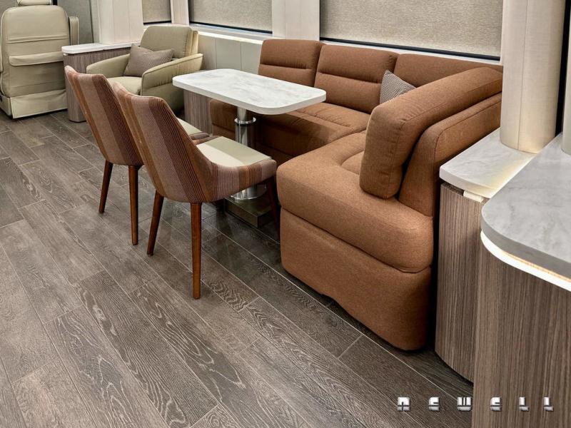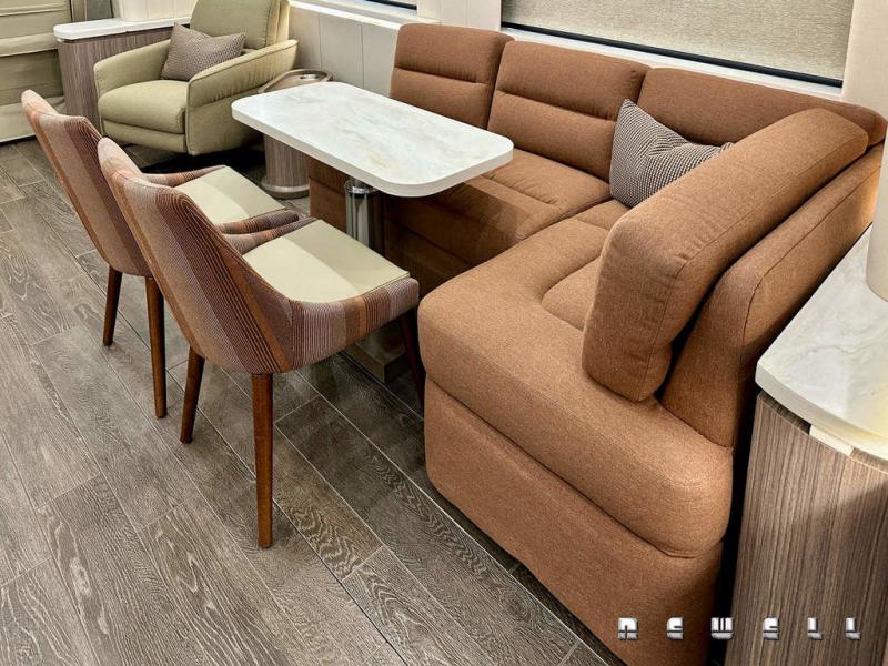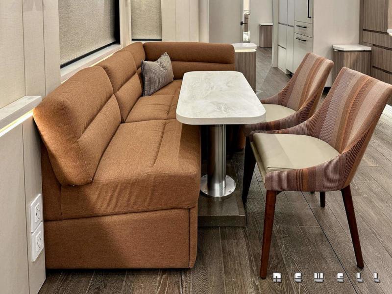 L-shaped fabric dinette with cantilevered top and two moveable chairsCustom appliance garage at galley with pull out tray