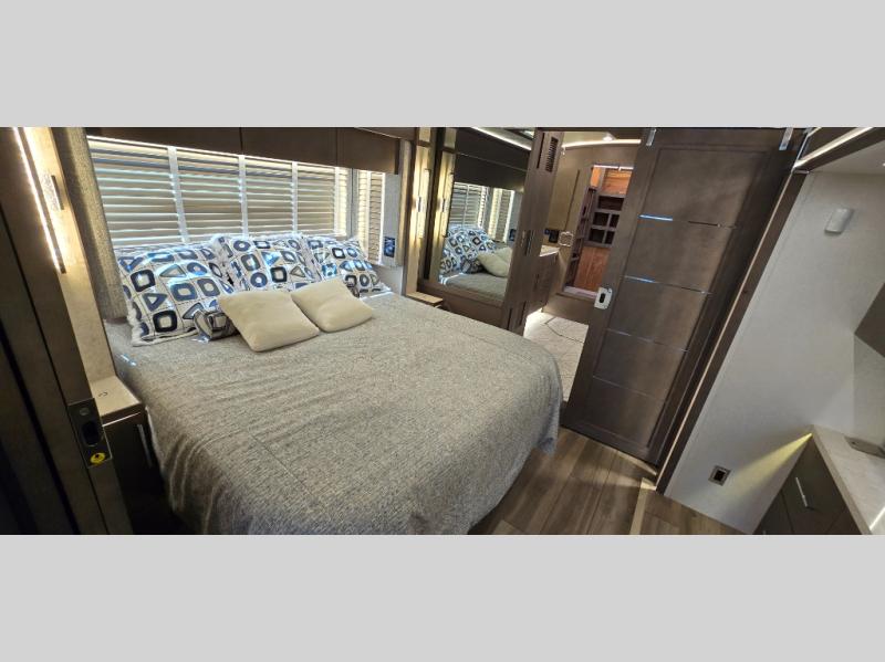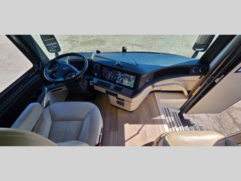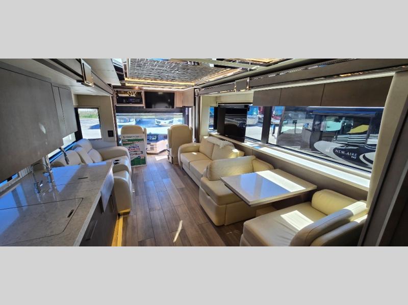 Luxury abounds in the King Aire Class A diesel motorhomes by Newmar. Each coach sits on a durable Spartan k3 tag axle chassis with the exclusive STAR foundation for added strength, durability, and better handling. You will love the Italian leather captain's seats, along with the industry-first Comfort Drive adaptive steering, Xite dash radio, wireless charging mats, and many more features to make the drive that much smoother. There are auto motion power shades inside, along with tile flooring, a down alternative fitted bedspread, and European style hardwood cabinets to name a few luxuries. The outstanding beauty doesn't end there; there are also super polished quartz countertops, full tiled shower walls and floor, electric radiant heat below the main floor tile, and the list goes on! Some of the innovative electrical features include a lithium ion battery system, a 12.5 kW Cummins Onan diesel generator, a doorbell and camera system, and a passive entry system. Each model can also be customized to your liking with traditional or contemporary exterior design options, four interior decor choices, and four hardwood stain options available in diamond gloss and suede finishes!