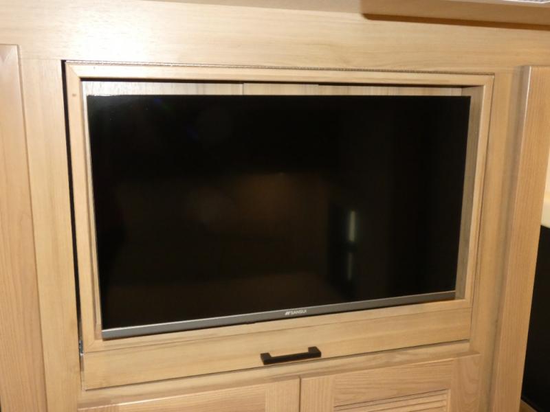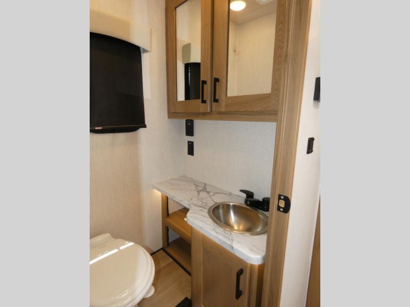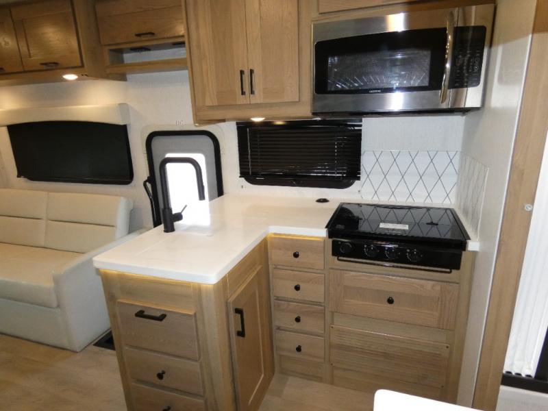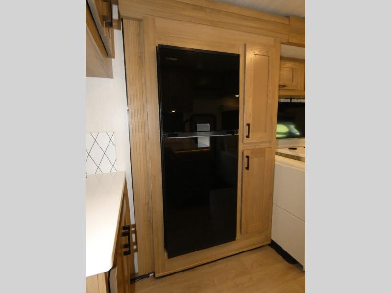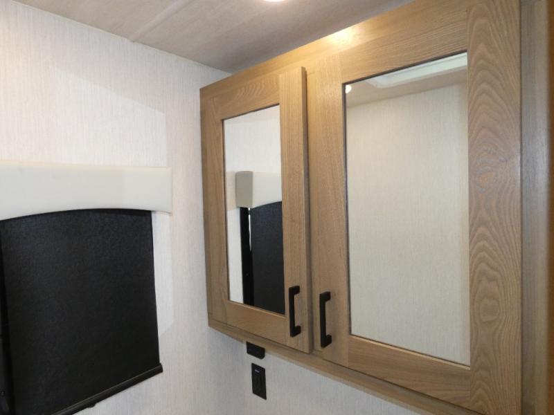 The rear bedroom is a serene retreat, featuring a king bed, TV, washer/dryer prep, and wardrobe for all your favorite belongings—the perfect place to relax and recharge after a long day of adventure. The full bathroom adds convenience along with overhead cabinets for added storage. And with a convenient location near the rear bedroom, you'll have everything you need to stay clean and comfortable on the go. The kitchen is a culinary dream, equipped with a fridge, pantry, microwave, and overhead cabinets for all your cooking needs. The living room is the heart of the home, featuring a jackknife sofa, TV, overhead cabinets, and dinette for relaxing and enjoying meals. And with the bunk-over cab with an optional entertainment center, the kids will have their own cozy retreat