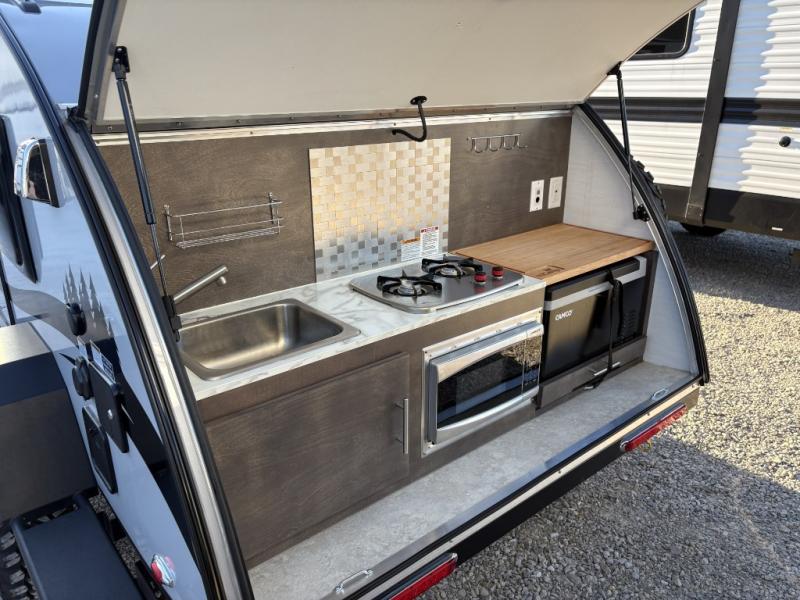 With any nuCamp RV TAG teardrop trailer, you can bring some of the comforts of home with you as you easily tow this lightweight trailer to the campgrounds. The outdoor kitchen includes a stainless steel sink and two-burner stove so you won't have to cook over a campfire each day. Inside, you'll find a composite floor, deluxe Amish cabinetry, sleeping accommodations, and a power roof fan to keep you comfortable. You will also appreciate the Convenience Package that comes with a 180-watt solar panel, a portable Bluetooth speaker, a 100 Ah 12-volt Lithium battery, and more!
