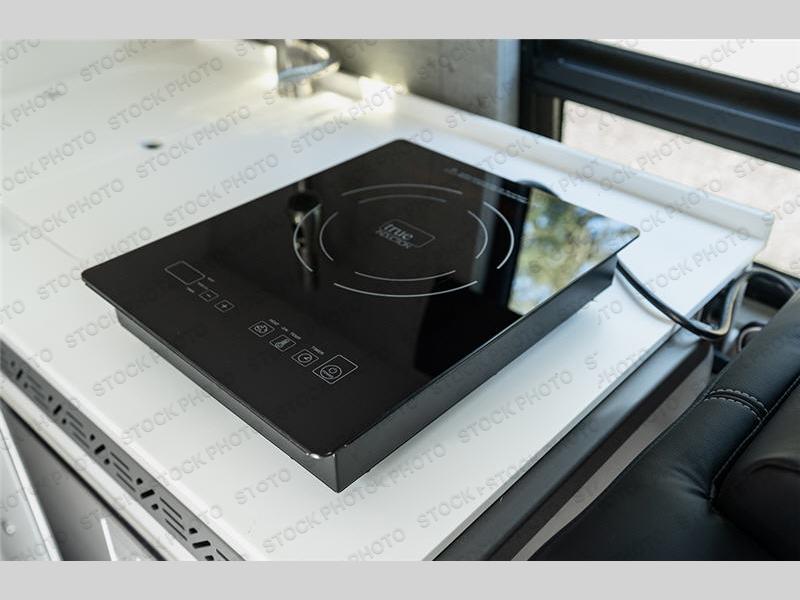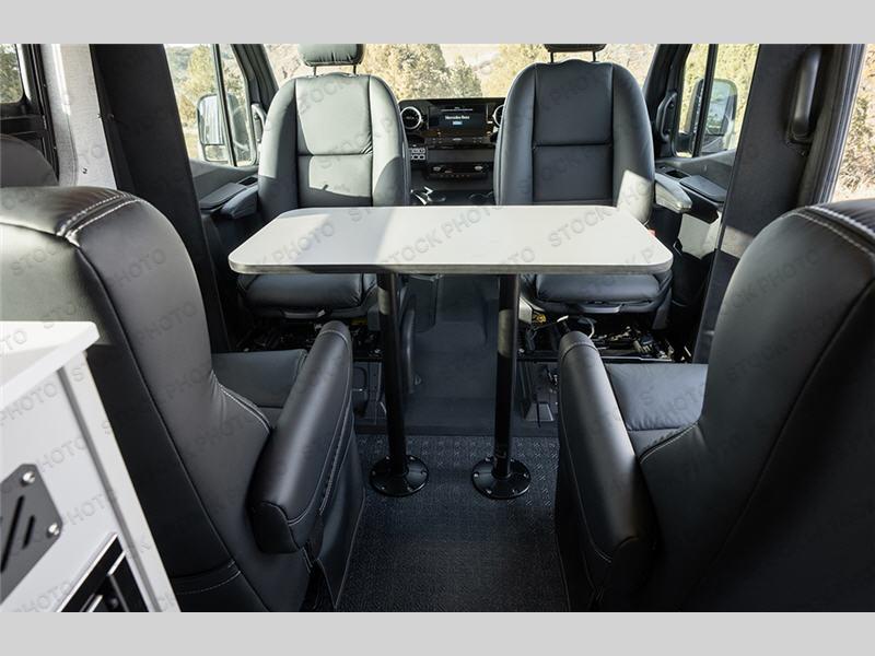 You will love the convenience and comfort that this unit offers your family or group of four. There are four captain's chairs in total with the driver and passenger seats able to swivel around for conversation with a removeable two-post table in the front position to enjoy your morning coffee. This table can also be placed in back between the convertible dinette when not in the sleeping position for meals. You will appreciate the induction cooktop and microwave oven for creating meals on the go, and there is also a stainless steel sink and refrigerator. A hidden water box contains a discrete porta-potty and shower system when needed and there is also a rear exterior shower hook-up with hose and magnetic shower curtain if you need to rinse off outside before heading in. Four can comfortably sleep with the convertible dinette in back with upper removeable bed above.