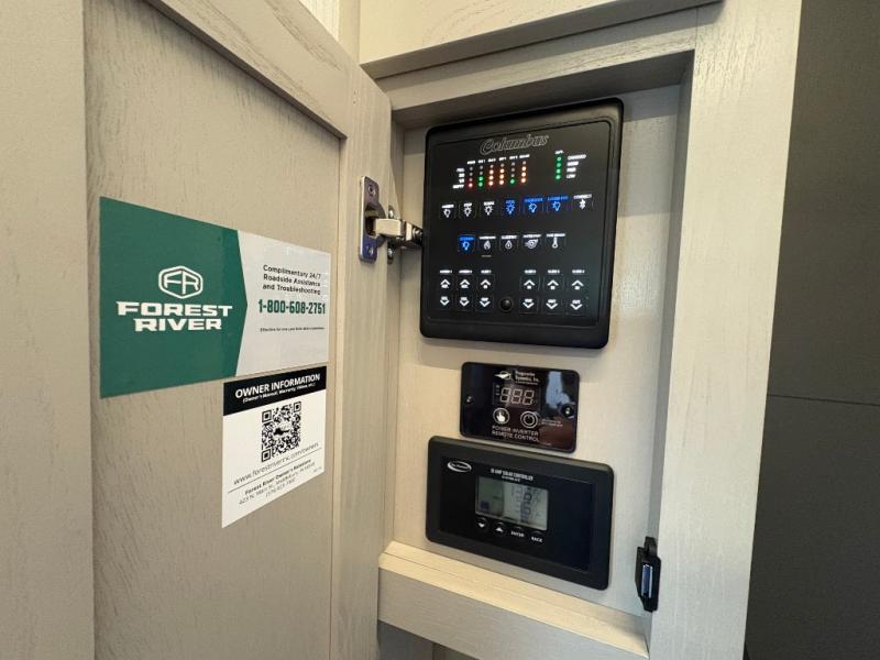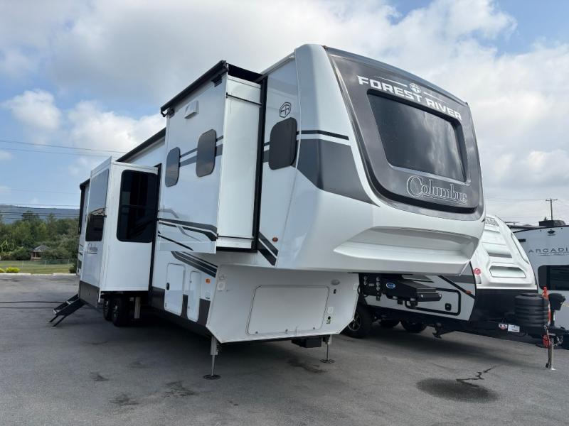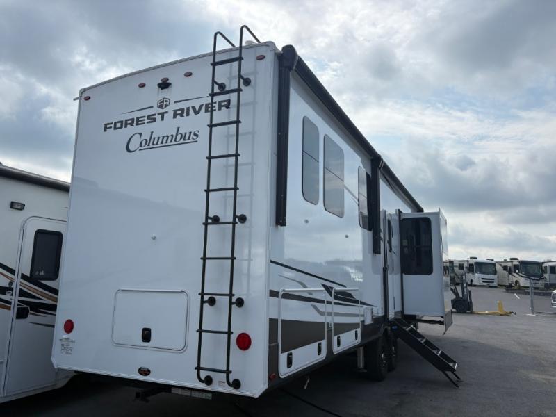 Experience a different camping life with residential furnishings and high end features in each one of these Palomino Columbus fifth wheels! The 101" wide body lets you walk around more throughout and the all-welded aluminum-frame superstructure has a snap-in ceiling molding to hold up through every adventure. Don't leave any of your gear behind either when you can easily store it in the climate controlled drop frame storage area. On the exterior, you'll find a heated utility convenience center, an outside sprayer to keep the dirt outside where it belongs, and magnetic compartment door holds to keep them from falling on you as you grab your items. Plus, there are some modern features that will really seal the deal like the Wi-Fi Booster with 4G LTE capability prep, upgraded true solid-surface countertops, power theater seating with USB charging, and a 260W solar panel for off-grid camping!