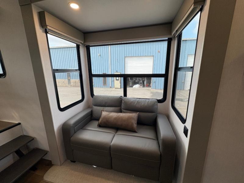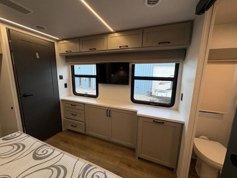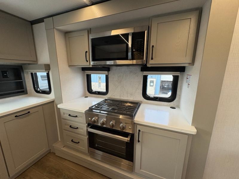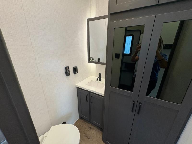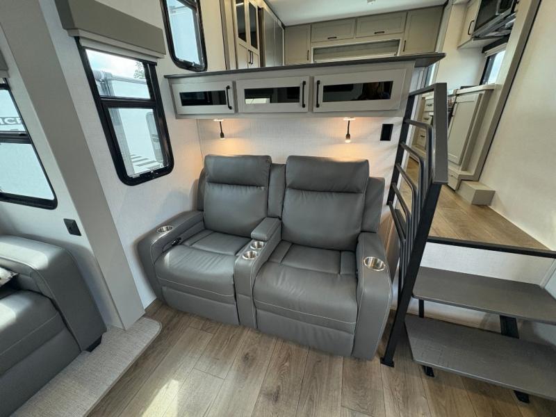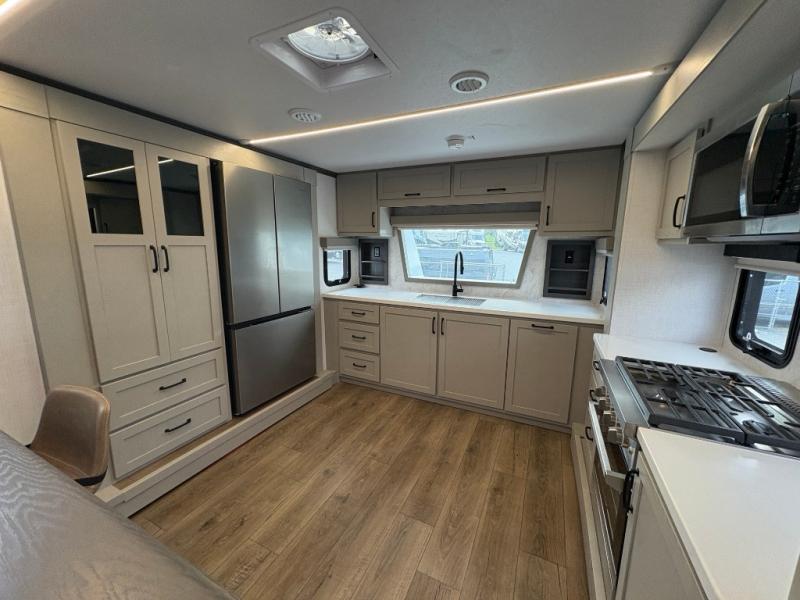 The front kitchen in this fifth wheel is a chef's dream come true while camping! There is generous counter space up front and beside the range, plus a pantry and 12V 18 cu. ft. 3-door refrigerator with ice. There is also a hi-top table with two bar stools that overlooks the living area. Inside the living area there are opposing sofa sleeper slides and power theater seating across from an entertainment center with a 50" Smart TV. A mid-coach half bath is easily accessible, and the full rear bath with dual bath sinks will create a master bedroom you are sure to love. There is a king bed slide out, a wardrobe, hamper, and a TV/storage.