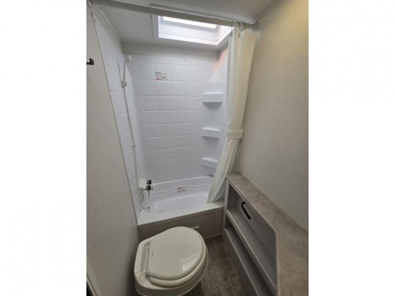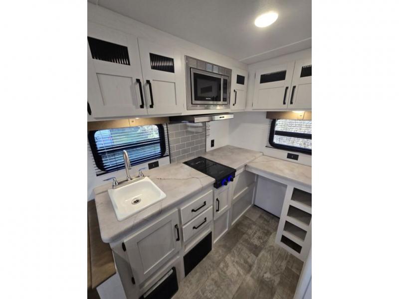 You will love camping in this 8' wide single axle travel trailer! Start your mornings feeling refreshed after sleeping on the front 60" x 74" queen bed with a shirt closet at the foot. You could even transform the sofa and booth dinette into extra sleeping spaces when you aren't using it to enjoy a delicious home cooked meal with the cooktop and stainless steel microwave. If you choose to add the optional outside micro kitchen with a griddle, you can enjoy some fresh air while cooking dinner. After a fun day at the beach, you can head to the rear corner bathroom and rinse the sand out of your hair in the 24" x 38" tub!