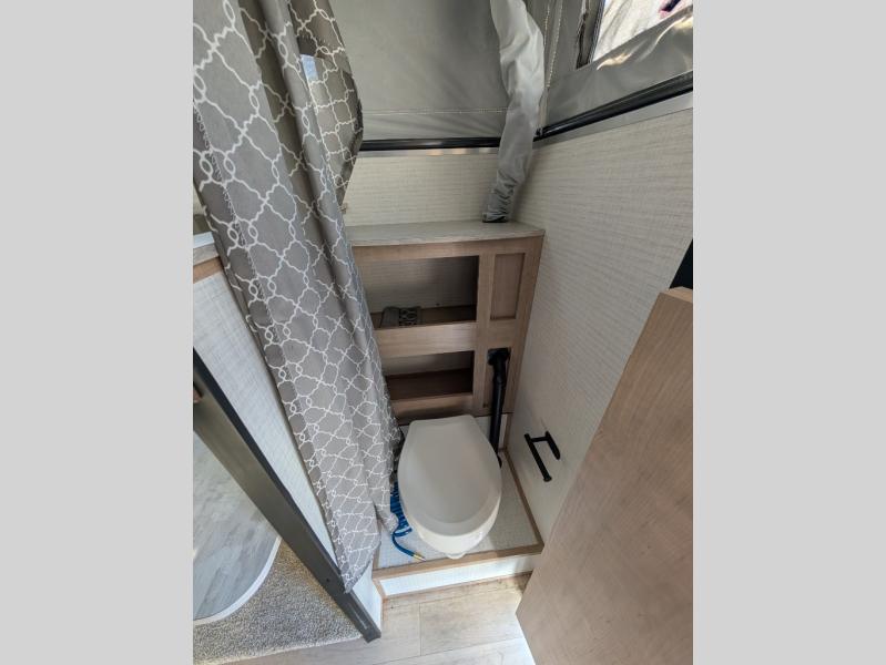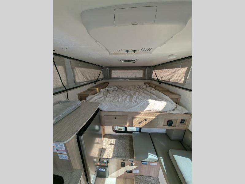 You're going to love camping in this truck camper for three! Once you arrive at the campground, use the electric roof lift with a remote for easy set up, then head inside to make lunch on the two burner cooktop. You can enjoy your meals at the dinette, and the ingredients can go back in the pantry and three-way refrigerator when it's time to clean up. There is a comfortable queen bed up front with foot lockers for your belongings, plus the private toilet on board will be super convenient for nighttime restroom breaks!