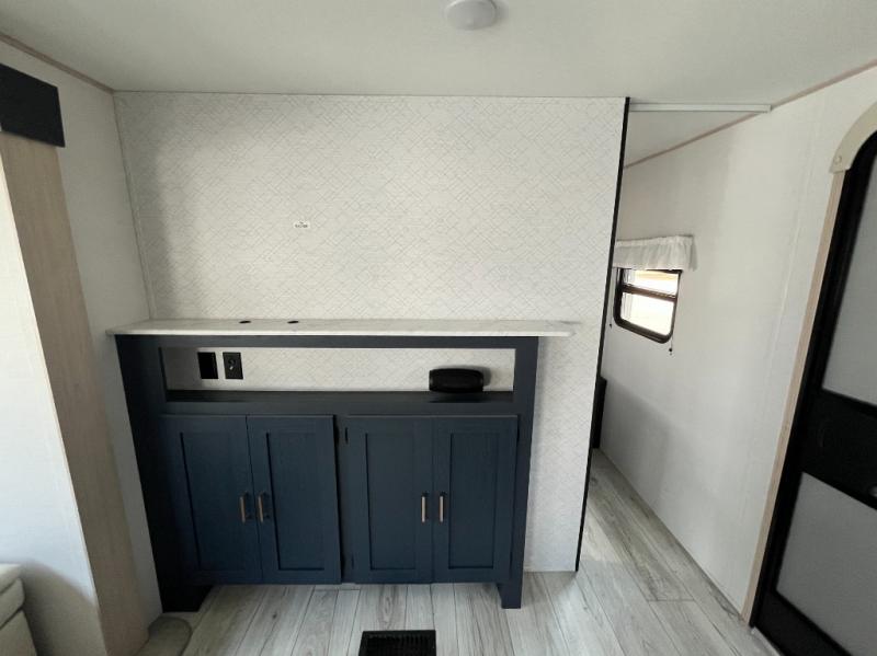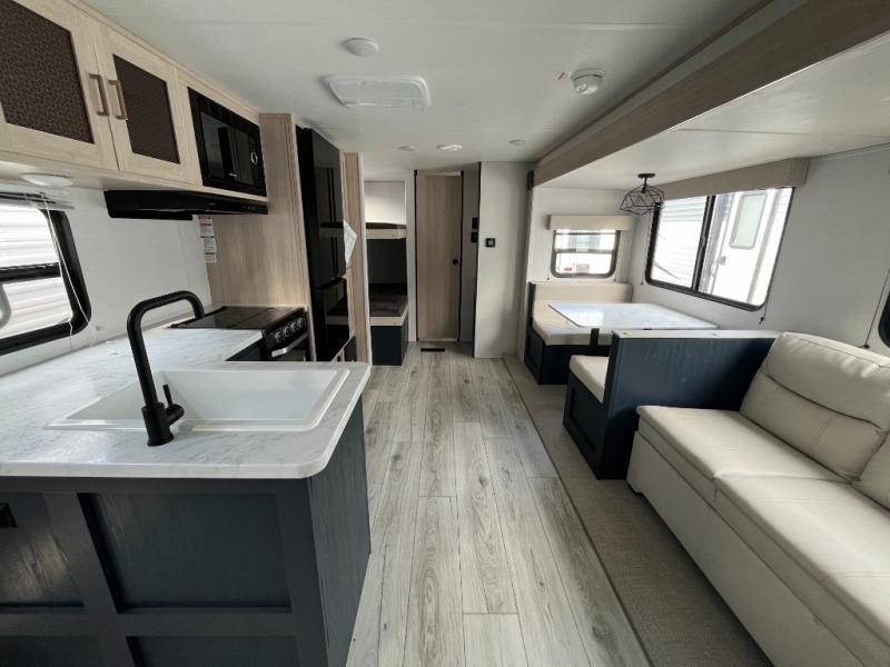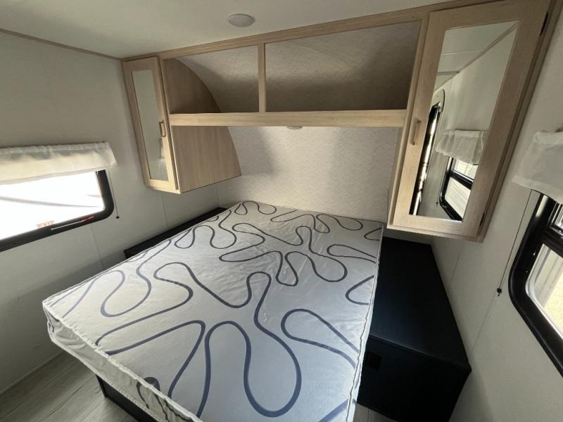 Looking for a trailer that houses everyone? This trailer offers lots of sleeping choices with a set of double-size bunks, a queen bed and furniture that doubles as sleeping space! You will also appreciate the added interior space thanks to the large slide in the living area that features a booth dinette and sofa. Up front, there is a private bedroom where you can retreat to at night away from the bunks in the back, and the bedroom features ample storage with dual wardrobes and an overhead shelf for your things.