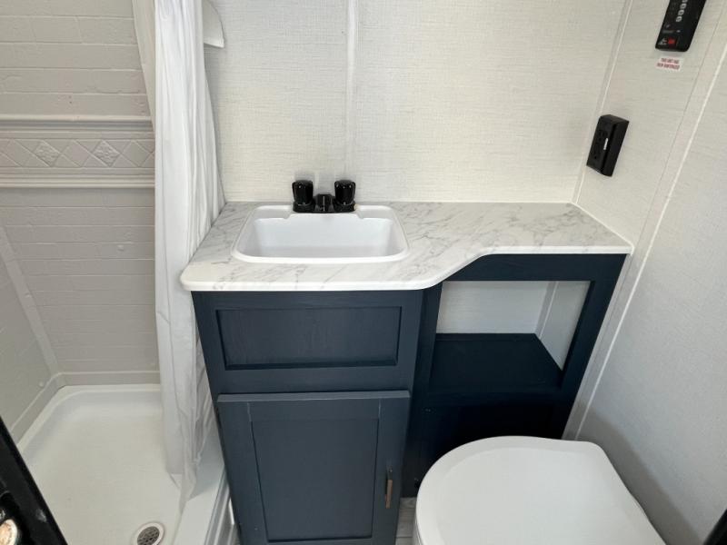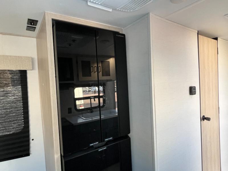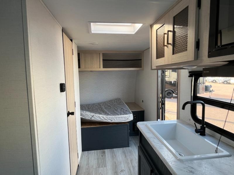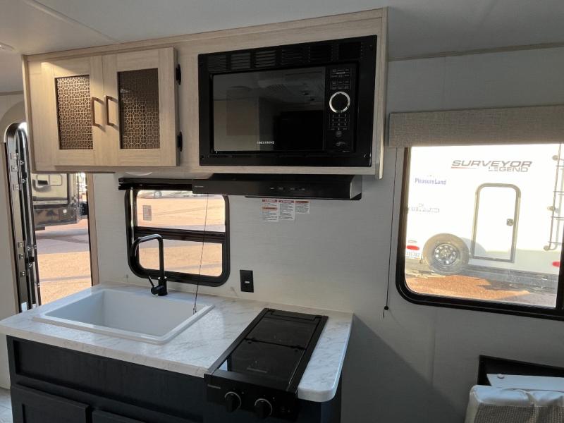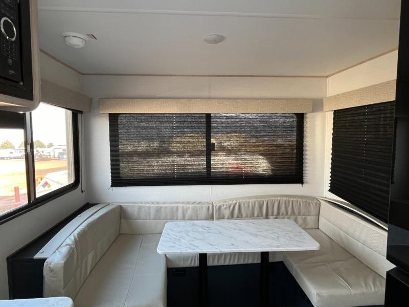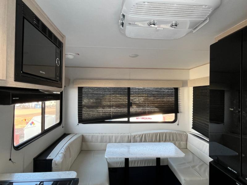 Camping with your friends or family doesn't have to be hard! This easy-to-tow, store and clean up RV allows two to four people to sleep comfortably on the U-shaped dinette along the rear wall with a large window and the front bed with nightstand. The kitchen includes a 10.7 cu. ft. 12V refrigerator, a microwave, plus a two-burner cooktop for preparing meals just like you do at home.