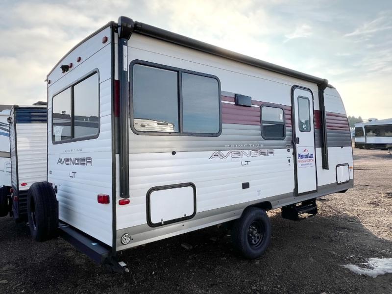 With any Avenger LT travel trailer by Prime Time, the exterior includes an aerodynamic smooth front metal, a front diamond plate for protection on the road, and two stabilizer jacks. There is also exclusive Everlast construction, a PVC roof membrane, and solar prep for the option to go off-grid. The interior offers seamless Carefree Congoleum flooring for easy cleanup and durability, pleated night shades throughout for privacy, a bottle opener, and residential extended ball bearing drawer guides.