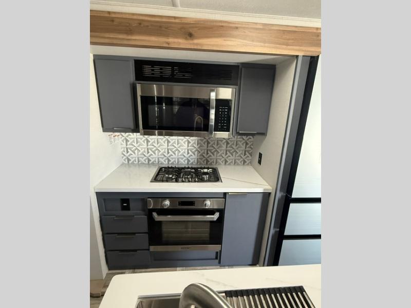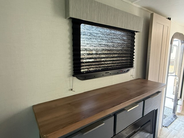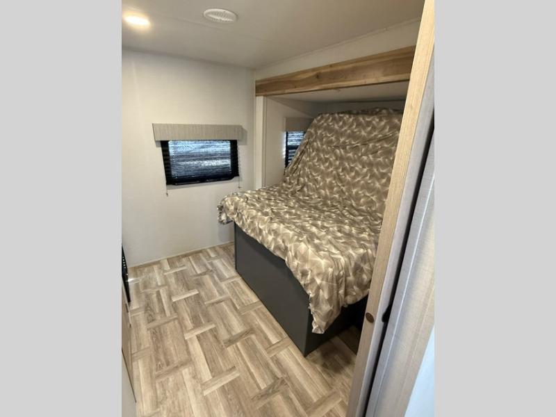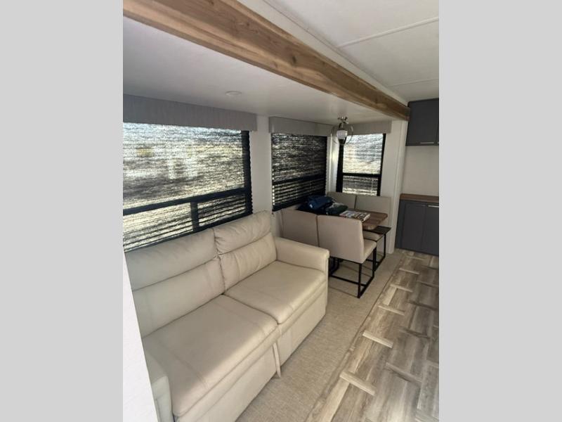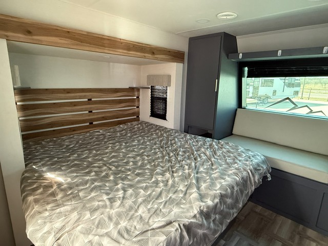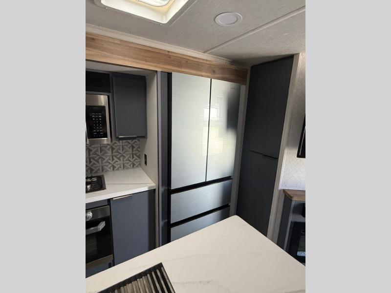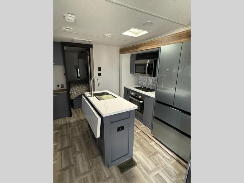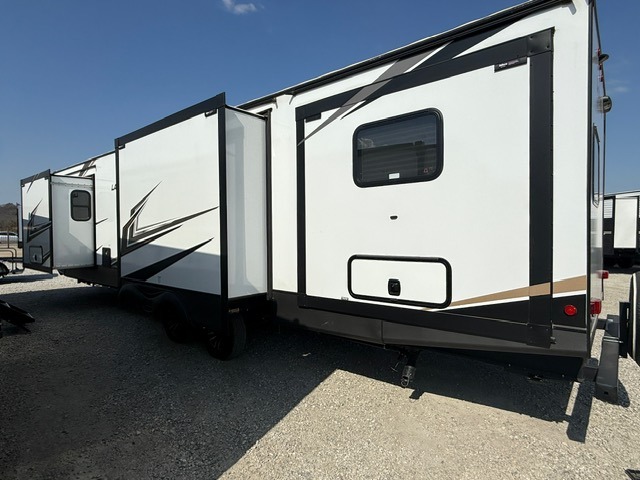 Privacy abounds in this travel trailer with a bedroom at each end! A king bed slide in the front has its own fireplace for cozy nights. Dual wardrobes frame the reading bench which looks out the front window for peaceful moments appreciating the view. At the rear, a second bedroom with queen bed has its own half bath. A pantry closet here also has prep for an optional washer/dryer for convenience on the road. In the center everyone can meet up in the spacious kitchen/living room. A hide-a-bed sofa has even more sleeping space, or relax there and watch the TV which is in the entertainment center along with another fireplace. The kitchen is well-equipped with a three-burner cooktop, microwave, and even an island where the sink is located for easy meal prep. Outside there are not one but two 10' power awnings for extra protection from the elements!