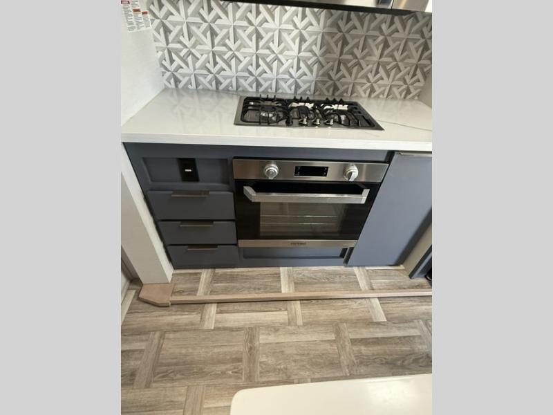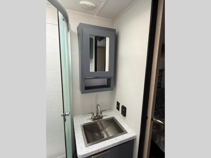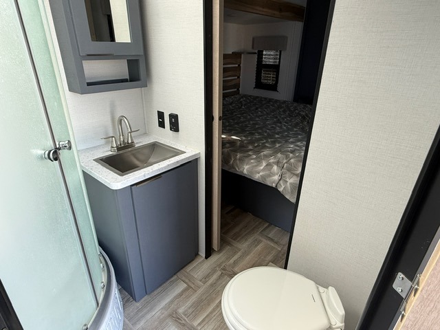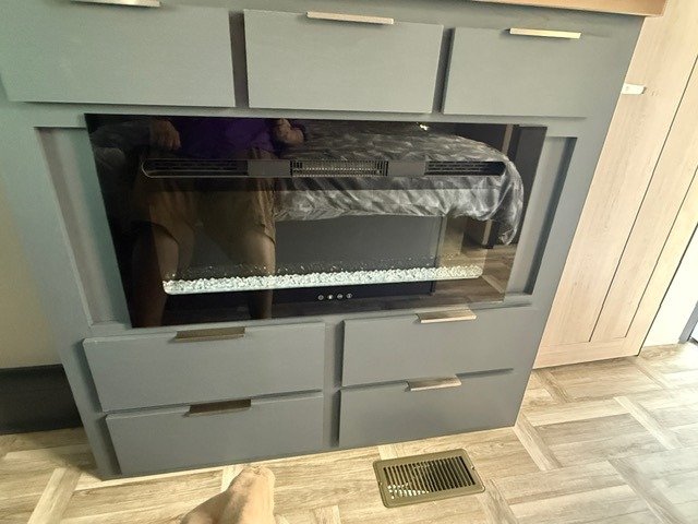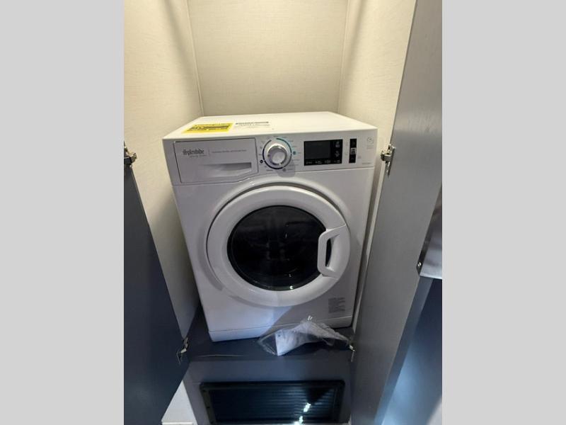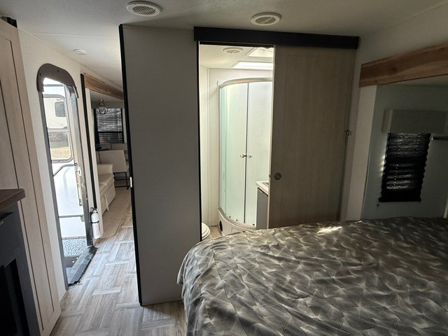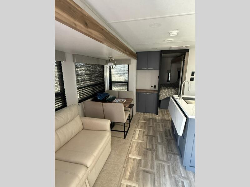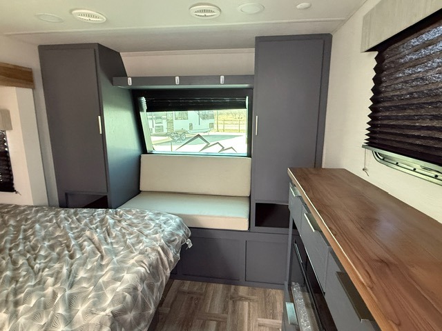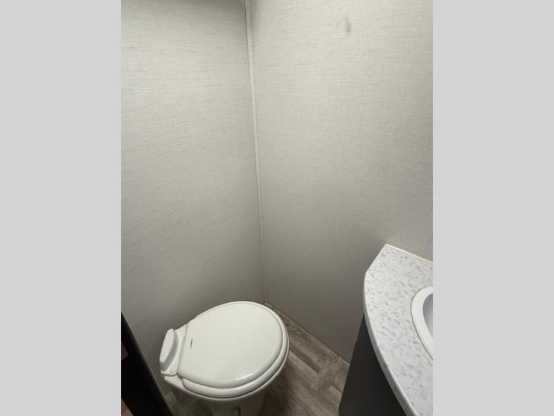 Privacy abounds in this travel trailer with a bedroom at each end! A king bed slide in the front has its own fireplace for cozy nights. Dual wardrobes frame the reading bench which looks out the front window for peaceful moments appreciating the view. At the rear, a second bedroom with queen bed has its own half bath. A pantry closet here also has prep for an optional washer/dryer for convenience on the road. In the center everyone can meet up in the spacious kitchen/living room. A hide-a-bed sofa has even more sleeping space, or relax there and watch the TV which is in the entertainment center along with another fireplace. The kitchen is well-equipped with a three-burner cooktop, microwave, and even an island where the sink is located for easy meal prep. Outside there are not one but two 10' power awnings for extra protection from the elements!