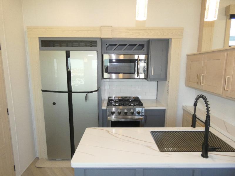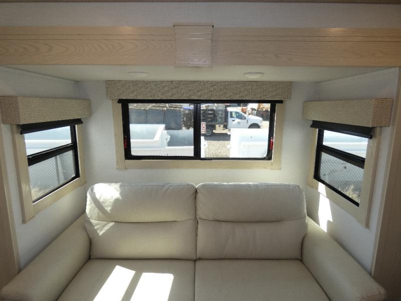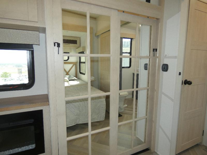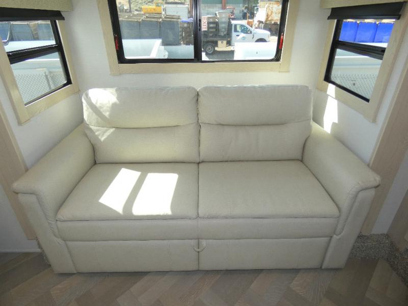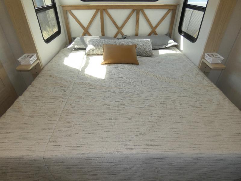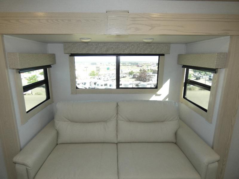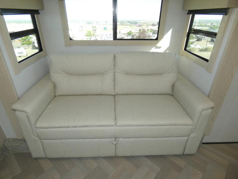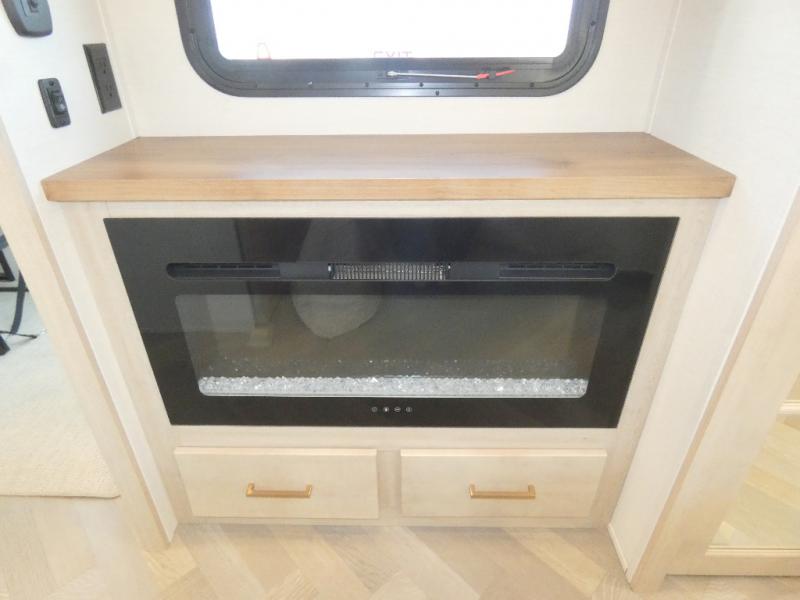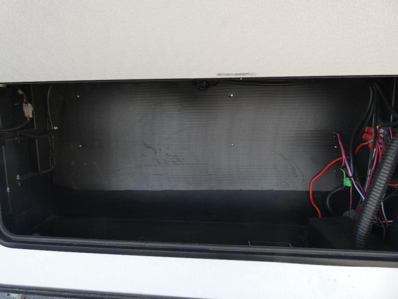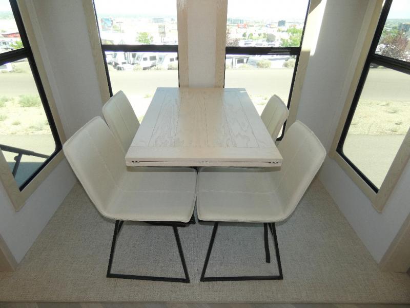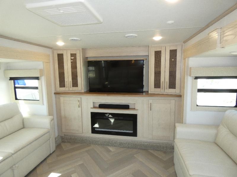 It's a clean decision with a bath and a half to take this fifth wheel on your next adventure! The front living area includes opposing EZ glide couches, 65" theater seating, and a front entertainment with a Smart LED pop up TV and fireplace for a cozy evening indoors. Prepare meals on the four burner cooktop, and leftovers can go in the 16 cu. ft. French door 12V refrigerator. You and your spouse will love the master suite that includes a king bed slide, plenty of storage space, and an entrance into the full rear bathroom with a dual sink vanity. There is even a linen closet with washer and dryer prep if you want to add those appliances!