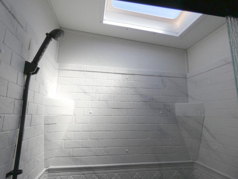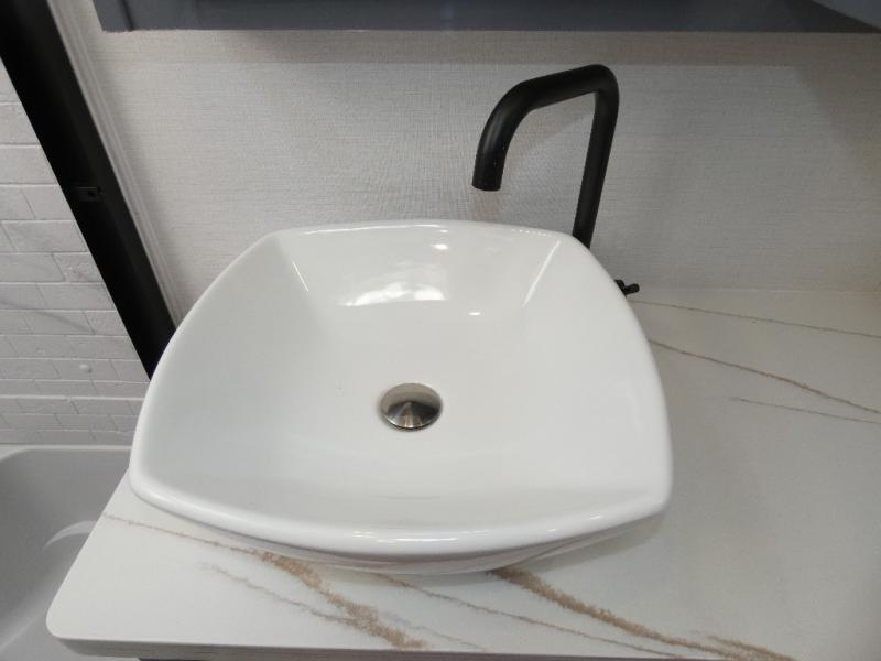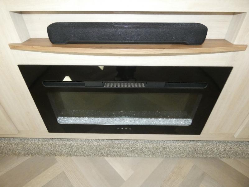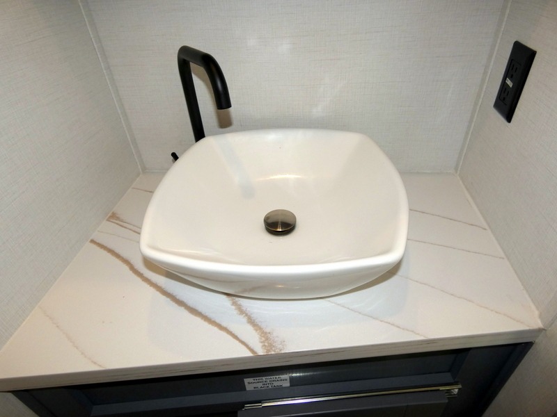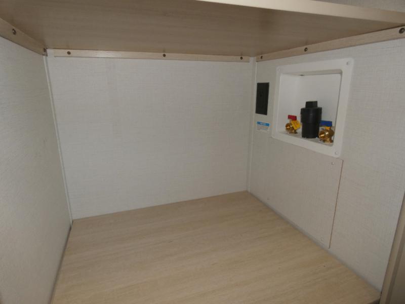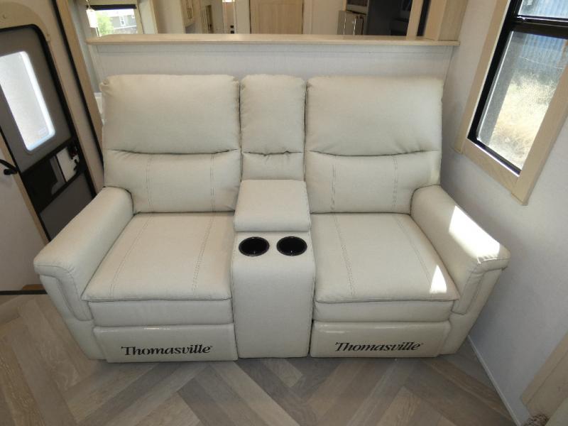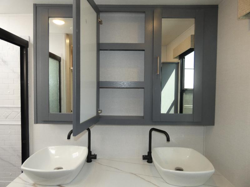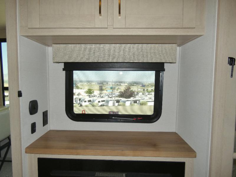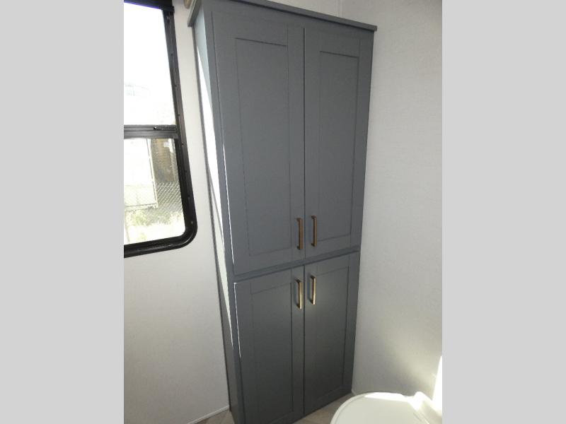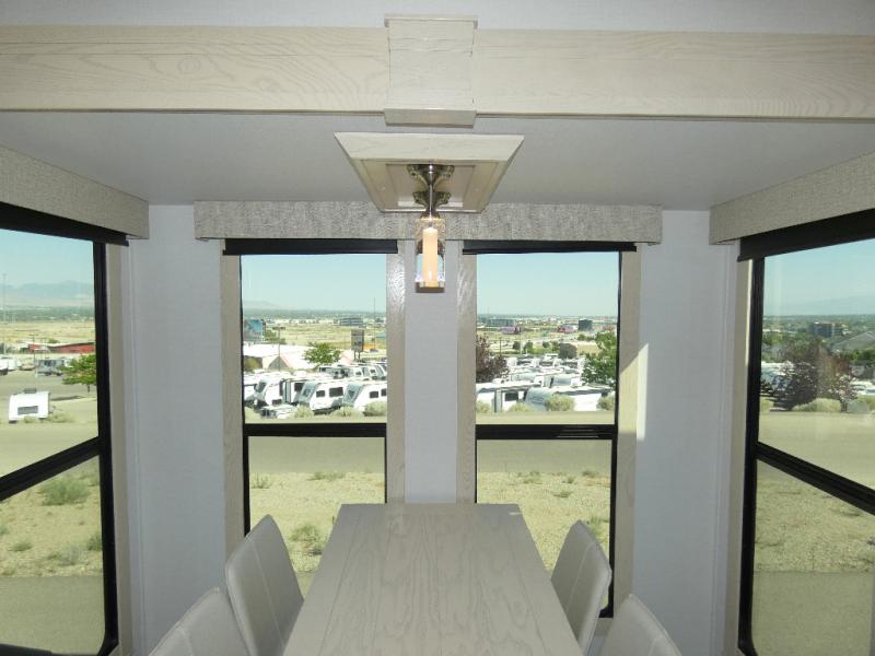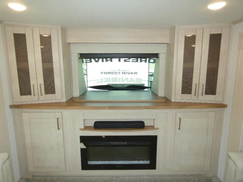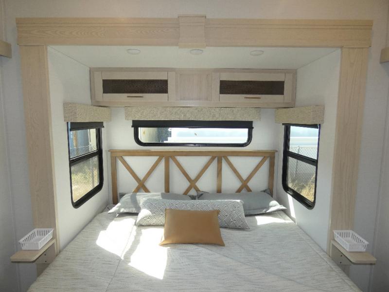 It's a clean decision with a bath and a half to take this fifth wheel on your next adventure! The front living area includes opposing EZ glide couches, 65" theater seating, and a front entertainment with a Smart LED pop up TV and fireplace for a cozy evening indoors. Prepare meals on the four burner cooktop, and leftovers can go in the 16 cu. ft. French door 12V refrigerator. You and your spouse will love the master suite that includes a king bed slide, plenty of storage space, and an entrance into the full rear bathroom with a dual sink vanity. There is even a linen closet with washer and dryer prep if you want to add those appliances!