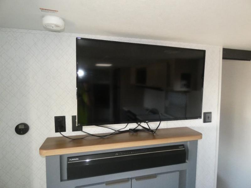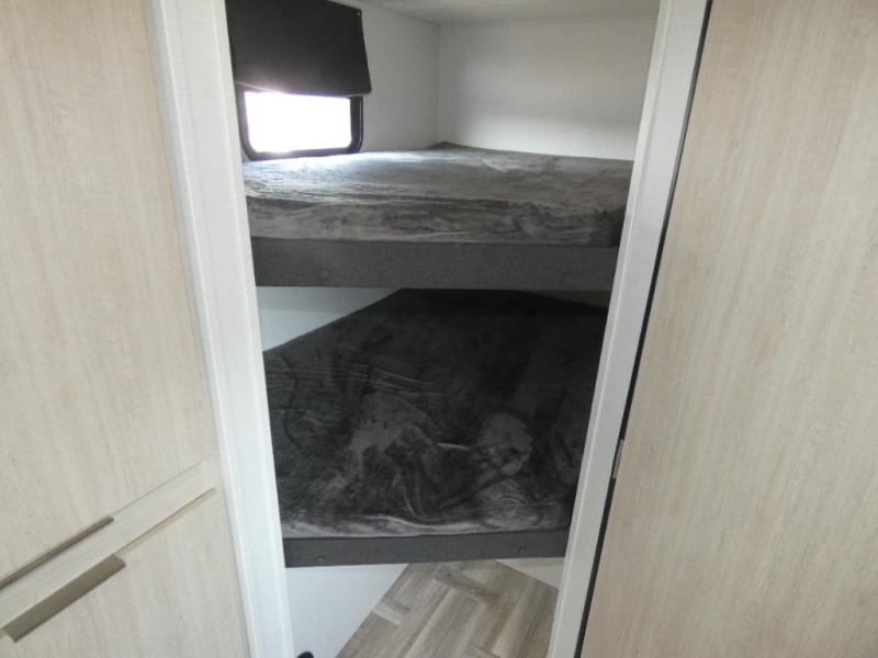 If you are looking for a trailer with double-size bunks and a private bedroom, you have found it! The queen bed and two wardrobes are behind a partial wall for added privacy. The double-size bunks are in the rear corner next to the full bathroom for convenience for the kids or your guests. And the L-shaped counter with a kitchen sink and full amenities sets up the cook nicely to be able to make meals for everyone. And you will love the extra floor space created by the booth dinette and sofa slide out.