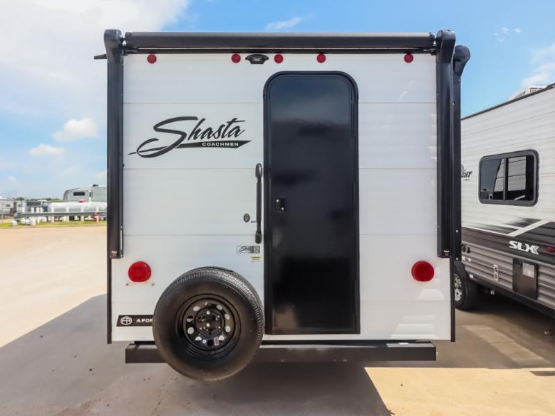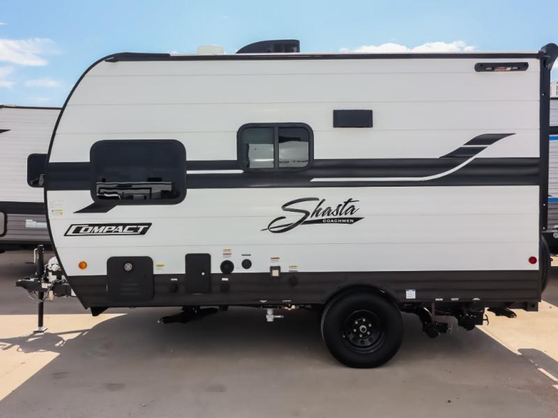 With any Compact travel trailer by Shasta RVs, you will enjoy the camping lifestyle in an easy-to-tow, lightweight unit! Each model includes four stabilizer jacks to keep your travel trailer secure at the campground, and an optional power tongue jack can be added for more convenience. You will appreciate having a tankless water heater for endless hot showers, an 8K BTU A/C to keep you cool, plus solar and back-up camera prep. The interior of each Compact travel trailer includes seamless countertops, kitchen and bath amenities, a Bluetooth portable speaker, plus storage space for all your belongings.