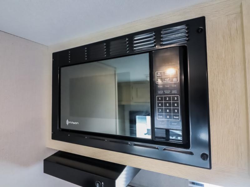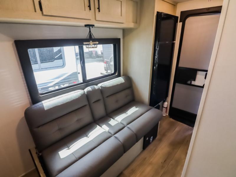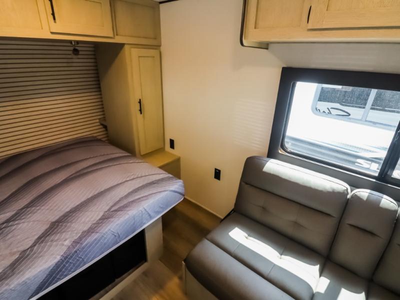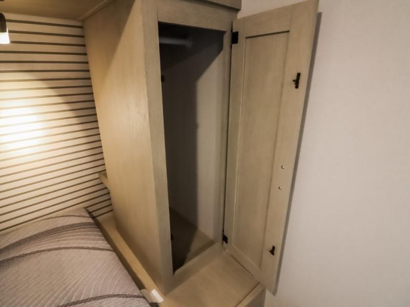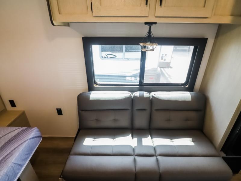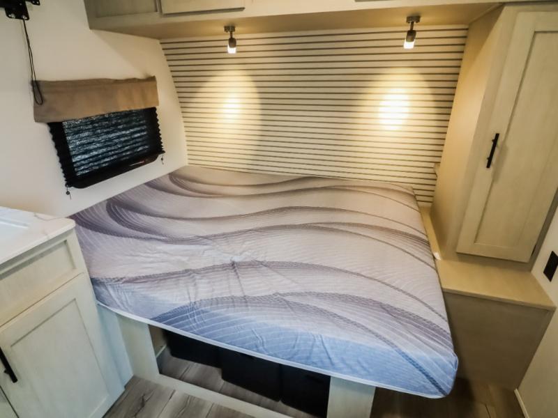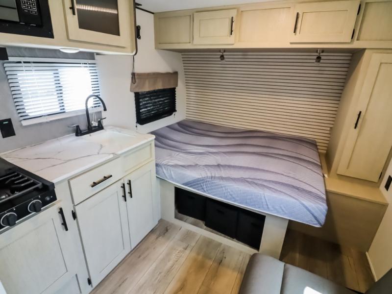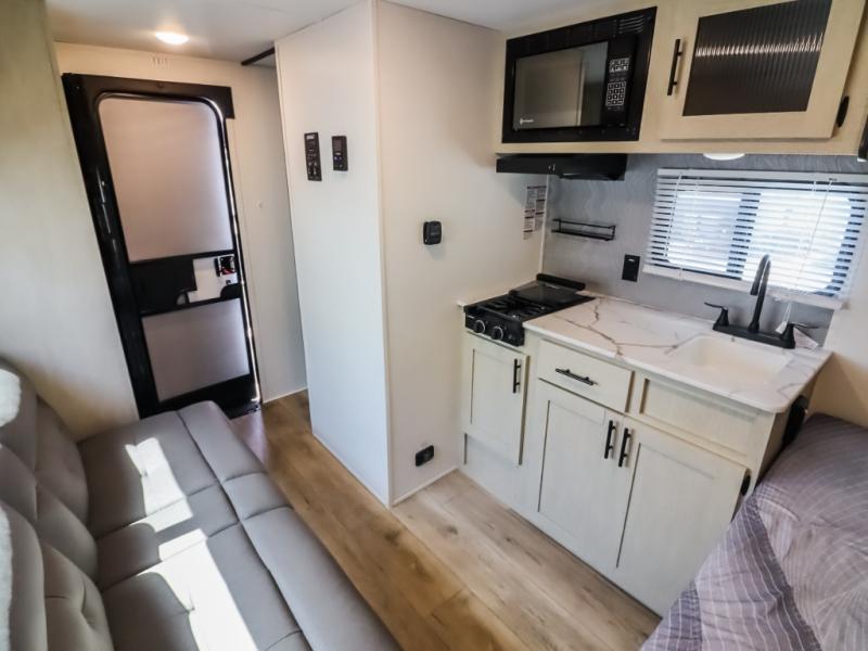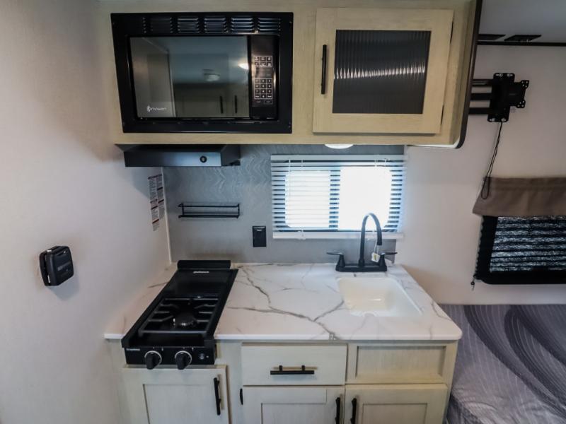 This trailer is perfect for couples or weekend trips to the lake with your buddy. There is a front queen bed with an overhead cabinet, a wardrobe, plus a bed shelf to keep valuables close by, and the sofa will provide seating and sleeping space for guests. There is a private bathroom with a toilet and a shower so you won't have to use the camp's facilities in the middle of the night. You will love having a two burner cooktop and microwave oven to cook meals each day, plus there is a 4.5 cu. ft. refrigerator for cold items!