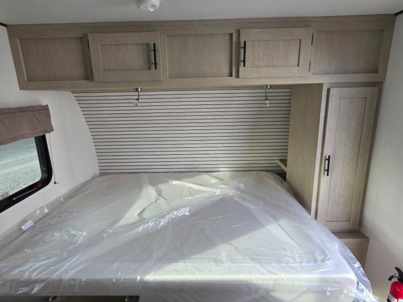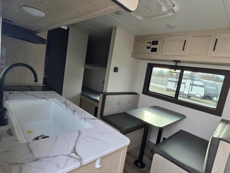 If you're looking for lightweight travel trailer with bunks, this is the one! There is even bunk storage so the kids or your guests can keep their things tidy, and you'll love the front RV queen bed all to yourselves. The full bath with a sink, toilet, and 24" x 40" shower pan will let everyone fresh up after a day outdoors. Once the chef of your group has made lunch in the kitchen, you can dine at the booth dinette or take your plate outdoors to sit at the campground picnic table. This model also includes plenty of storage space, including an exterior pass-through for fishing poles, hiking gear, and more!
